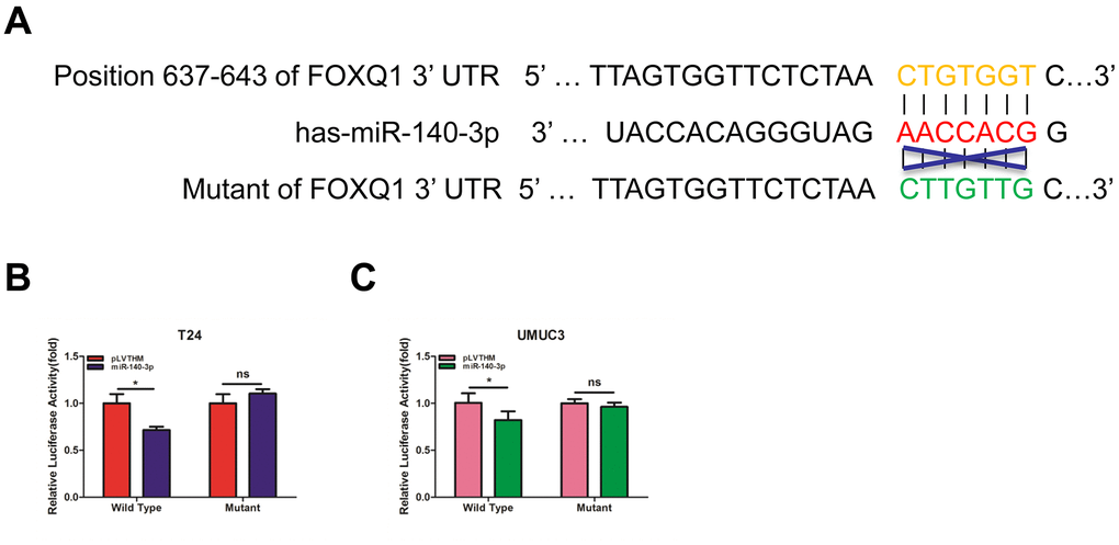 To verify that FOXQ1 is a potential downstream target of miR-140-3p, we used online bioinformatics databases (miRDB, Targetscan and MicroCosm) for analysis. The predicted interactions between miR-140-3p and the binding sites on the 3’-UTR of FOXQ1 mRNA are illustrated in Figure 3A. Results from luciferase reporter assays showed that in T24 and UMUC3 cells, transfection of miR-140-3p and wild-type sequences of the FOXQ1 3’-UTR decreased luminescence intensity. Altering miR-140-3p expression did not affect the luminescence intensity of the mutant FOXQ1 3’-UTR in either cell type (Figure 3B, 3C). Collectively, these data supported the hypothesis that miR-140-3p inhibited FOXQ1 expression by directly interacting with the 3'-UTR.