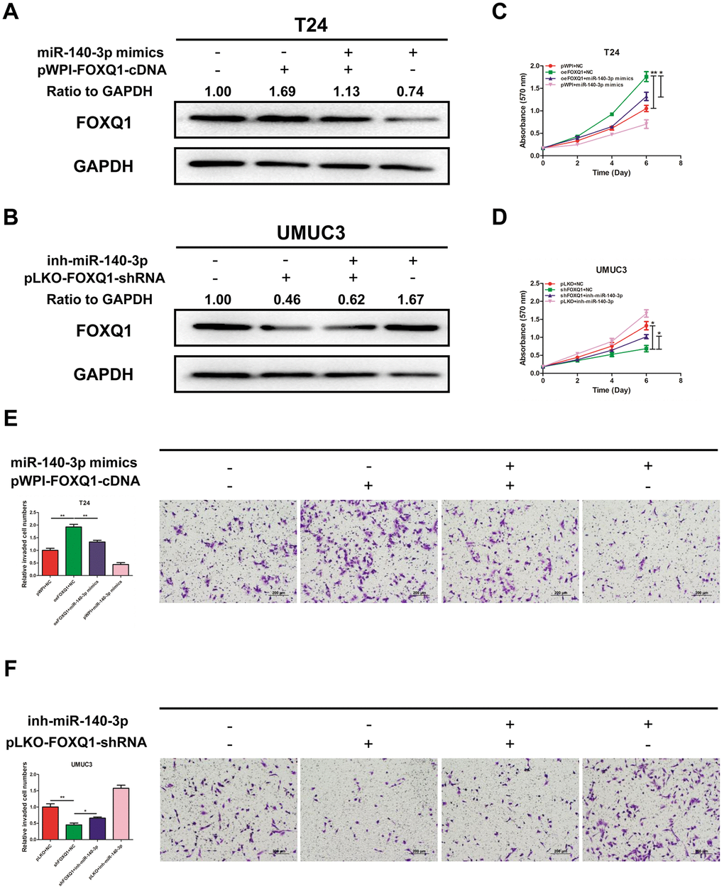 We explored whether miR-140-3p regulated FOXQ1 expression in BCa cells. The results of western blot analyses verified that miR-140-3p mimics reduced FOXQ1 expression in T24 cells and miR-140-3p inhibitor increased FOXQ1 expression in UMUC3 cells (Figure 4A, 4B). To determine whether miR-140-3p is involved in the FOXQ1-induced promotion of BCa cell proliferation and invasion, we conducted rescue experiments in T24 and UMUC3 cells. The results showed that miR-140-3p mimics partially reversed the increase mediated by overexpression of FOXQ1 on T24 cell proliferation (Figure 4C). In UMUC3 cells, a miR-140-3p inhibitor partially reversed the proliferation suppression mediated by knockdown of FOXQ1 (Figure 4D). We obtained similar results in both T24 and UMUC3 cells using an invasion assay in place of the cell proliferation assay (Figure 4E, 4F). These data verified that miR-140-3p suppressed FOXQ1-induced proliferation and invasion of BCa cells.