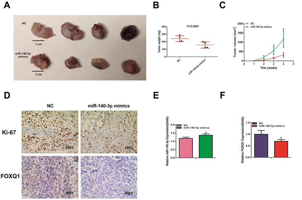 To identify the effects of miR-140-3p on BCa cell growth, we transfected T24 cells with either miR-140-3p mimics or a negative control. The cells were injected into nude mice subcutaneously. Tumor volume was monitored weekly. The mice were sacrificed 4 weeks after injection. The weights and volumes of the xenografted tumors were measured. As expected, miR-140-3p mimics dramatically decreased the tumor weights and tumor volumes compared with those of the negative control group (Figure 5A–5C). Our immunohistochemical staining demonstrated that both Ki-67 and FOXQ1 expression was significantly lower in the miR-140-3p mimics group than in negative control group (Figure 5D). We performed qRT-PCR to confirm that the expression of miR-140-3p increased in the miR-140-3p mimics group more than in negative control group (Figure 5E). The result of qRT-PCR also suggested that FOXQ1 expression was lower in the miR-140-3p overexpression group (Figure 5F). Together these data demonstrated that miR-140-3p suppressed the growth of BCa cells in vivo and might serve as a therapeutic marker in bladder cancer.