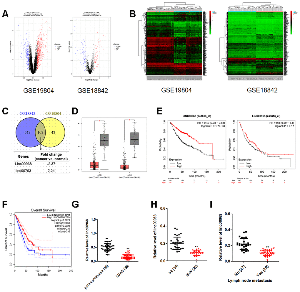 Initially, microarray analysis of expression profiles GEO: GSE19804 and GSE18842 displayed that linc00968 was significantly downregulated in NSCLC (Figure 1A–1C). The expression levels of linc00968 in both LUAD and LUSC were confirmed using TCGA dataset (Figure 1D). Using the Kaplan-Meier survival plot (http://kmplot.com/analysis/index.php?p=service&cancer=lung), we revealed that LUAD patients who had high level of linc00968 exhibited better overall survival (OS). However, the dysregulation of linc00968 was irrelevant with the OS of patients with LUSC (Figure 1E). To confirm this observation, the prognostic value of linc00968 in LUAD was further verified using TCGA. As shown in Figure 1F, higher level of linc00968 in patients with LUAD resulted in better survival rate. The levels of linc00968 in LUAD and para-carcinoma tissues from 56 cases of patients with LUAD were detected using qRT-PCR. As shown in Figure 1G–1I, linc00968 was significantly downregulated in LUAD. The dysregulated expression of linc00968 was negatively related to the lymph node metastasis (LNM) and clinical stage. However, linc00968 expression level was irrelevant with age, sex, and tumor size of LUAD (Supplementary Table 1). Taken together, these findings indicate that linc00968 is downregulated in LUAD.