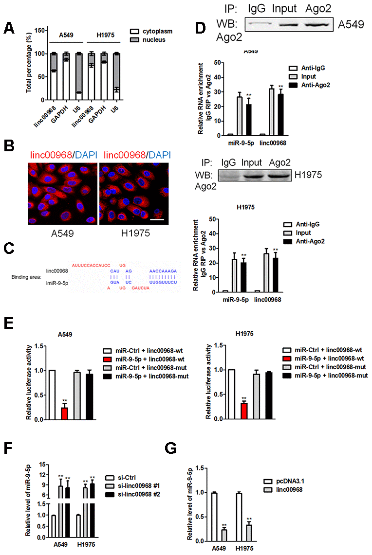 Then, we measured the localization of linc00968 in LUAD cell and observed that linc00968 was mainly localized in the cytoplasm of A549 and H1975 cell (Figure 3A). Similar results were obtained in FISH assay (Figure 3B). Using the human lncRNA targets prediction tool LncBase Predicted v.2, we predicted linc00968 could be targeted by several miRNAs. Among them, miR-9-5p (Figure 3C) has been proved to be involved in regulating the progression of caners [17–19]. Next, we determined the correlation between linc00968 and miR-9-5p using RNA RIP assay. As shown in Figure 3D, the Ago2 protein was distinctly immunoprecipitated from A549 or H1975 cell extracts, and both miR-9-5p and linc00968 were remarkedly enriched in anti-Ago2 group when compared with the anti-IgG group. Luciferase reporter gene assay suggested that transfected of miR-9-5p decreased the luciferase activity of linc00968-wt but had no suppressive impact on linc00968-mut (Figure 3E). Moreover, linc00968 silencing raised the levels of miR-9-5p in A549 and H1975 cell (Figure 3F). Meanwhile, upregulation of linc00968 markedly degraded the expression of miR-9-5p (Figure 3G). These findings indicate that linc00968 acts as a ceRNA and binds to miR-9-5p.