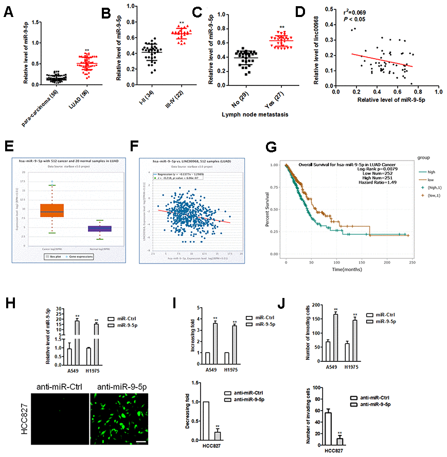 Early reports have revealed that miR-9-5p is an oncomiR during cancer tumorigenesis [20]. Consistently, miR-9-5p was also overexpressed in LUAD tissues compared to in para-carcinoma tissues (Figure 4A). The higher expression level of miR-9-5p was positively associated with the metastasis and advance stage, while miR-19-5p expression level was irrelevant with age, sex, and tumor size in patients with LUAD (Figure 4B, 4C). Importantly, an inversely relationship between miR-9-5p and linc00968 in LUAD tissues was observed (Figure 4D). In TCGA, miR-9-5p was significantly upregulated in LUAD and negatively associated with linc00968 expression (Figure 4E, 4F). Using the TCGA dataset, we also revealed that patients who had high miR-9-5p expression exhibited poor OS compared with patients had low miR-9-5p expression (Figure 4G). A549 and H1975 cell was transfected with miR-9-5p, while HCC827 cell was transfected with FAM labeled miR-9-5p inhibitor (anti-miR-9-5p) (Figure 4H). Functionally, colony formation and invasive capacities were heightened after A549 and H1975 cell were treated with miR-9-5p mimics (Figure 4I, 4J). In contrast, opposite trends in HCC827 were obtained when cell was treated with anti-miR-9-5p (Figure 4I, 4J).