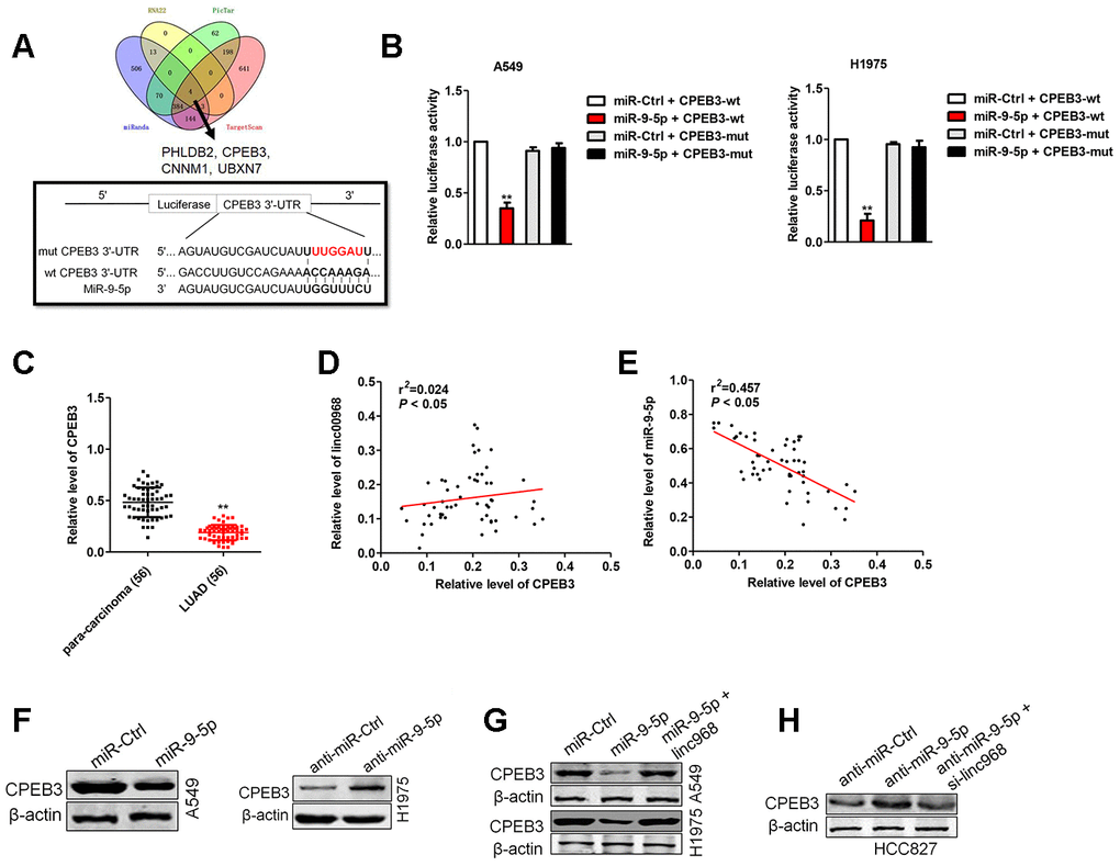 MiRNAs bind to the 3’-UTR of their target mRNAs and cause the repression of translation or the degradation of genes. To explore the precise functions of linc00968/miR-9-5p axis, we sought the downstream targets of miR-9-5p using bioinformatics methods. We observed that miR-9-5p might target CPEB3 via binding to its 3′-UTR. Moreover, the level miR-9-5p was negatively associated with CPEB3 level in LUAD samples, and we further demonstrated that miR-9-5p transfection decreased the expression of CPEB3 in LUAD cells in vitro. Furthermore, we revealed that linc00968 could reverse the impact of miR-9-5p on the expression of CPEB3 in LUAD cell. Meanwhile, addition of miR-9-5p reversed the suppressive effects of linc00968 on the growth and invasion of LUAD cell. However, CPEB3 knockdown reversed the suppressive influences of linc00968 on the growth and invasiveness of LUAD cell, which certificated the existence of linc00968/miR-9-5p/CPEB3 axis in LUAD.