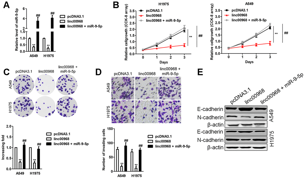 To affirm whether linc00968 exerts its impacts on LUAD cell by sponging miR-9-5p, “rescue” experiments were carried out to check the functional interactions of linc00968 and miR-9-5p. We found that after transfected miR-9-5p mimics into linc00968 overexpressing cell, the proliferation, colony formation and invasive capacities were obviously rescued compared with those of LUAD cell transfected with linc00968 alone (Figure 6A–6D). Next, the impacts of linc00968 on the EMT process of A549 and H1975 cell were analyzed. Immunoblotting analysis showed that the level of E-cadherin was upregulated after linc00968 was overexpressed, whereas N-cadherin was reduced after overexpressing linc00968, but this trend was partially abolished by reintroduction of miR-9-5p (Figure 6E).