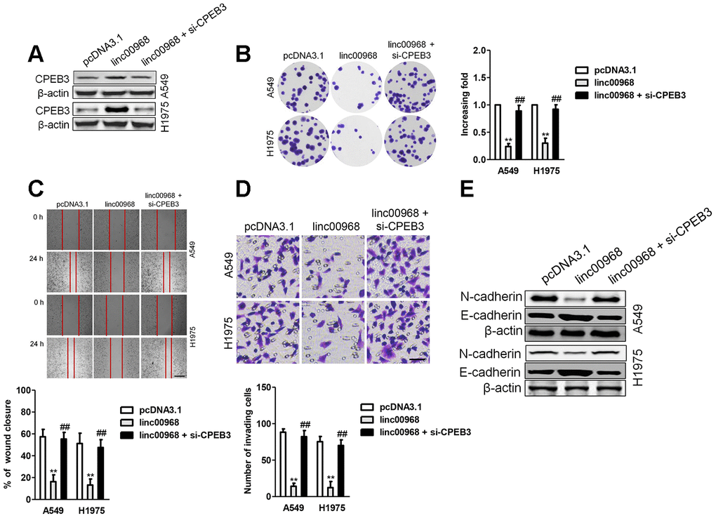 To demonstrate that linc00968 inhibits LUAD cell metastatic-phenotypes in a CPEB3-dependent manner, linc00968 overexpressing A549 and H1975 cell was transfected with siRNA CPEB3 plasmid (si-CPEB3). In A549 and H1975 cell, functional assays in vitro indicated that downregulation of CPEB3 rescued the viability and mobility of LUAD cell impaired by linc00968 (Figure 7A–7D). Besides, downregulation of CPEB3 increased the level of N-cadherin that was inhibited by linc00968. On the contrary, knocked-down of CPEB3 abolished the enhancive effect of linc00968 on the expression level of E-cadherin (Figure 7E). Taken together, CPEB3 silencing rescues LUAD cell proliferation, migration, and invasion that were inhibited by linc00968.