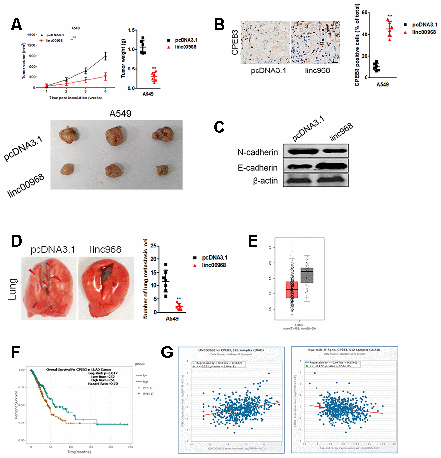 Finally, pcDNA3.1 or pcDNA3.1 expressing linc00968 stable transfected A549 cells were inoculated into nude mice. As shown in Figure 8A, the tumor volumes and weights in mice injected with linc00968 overexpressing A549 cells were markedly restrained compared with the pcDNA3.1 control group. Moreover, IHC staining displayed that CPEB3 level was raised in the linc00968-overexpressing xenograft tumor tissues (Figure 8B). Furthermore, western blotting analysis of tumor tissues suggested that linc00968 inhibited the EMT-markers in vivo (Figure 8C). Next, we detected the influence of linc00968 in the metastasis of A549 cell in experimental metastasis model. Our results revealed that the number of lung metastatic foci was reduced in mice injected with linc00968 overexpressed A549 cell compared with the vector group (Figure 8D). In TCGA, CPEB3 is significantly downregulated in LUAD and patients who had high CPEB3 expression exhibited better OS compared with patients with low CPEB3 expression (Figure 8E, 8F). Finally, an inversely relationship between miR-9-5p and CPEB3 whereas a positively relationship between CPEB3 and linc00968 in LUAD tissues were found (Figure 8G). These findings further verify the functions of linc00968 in LUAD cell proliferation and metastasis in vivo.