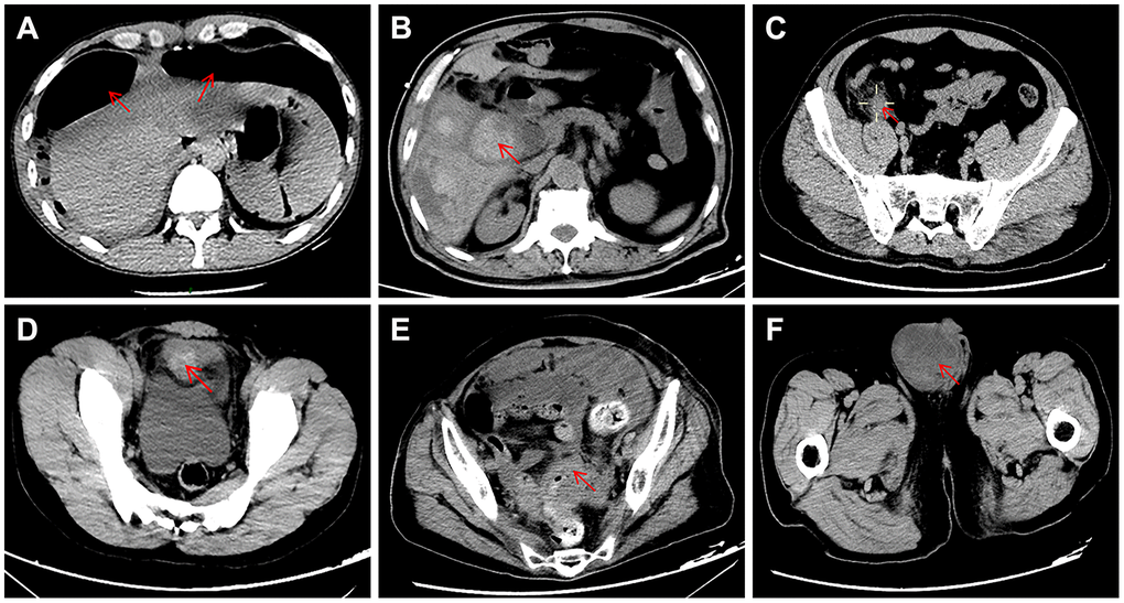 Of the 28 patients who did not have COVID-19 pneumonia (9 female and 19 male; mean age 55 years (range 17–87)), 12 (43%) patients were diagnosed with acute appendicitis, 10 (36%) with gastrointestinal perforation, 5 (18%) with intestinal obstruction and 1 (4%) with bladder rupture. The typical abdominal CT appearance is shown in Figure 1. Comorbidities were found in 17 (61%) patients and included diabetes mellitus in 7 (25%), coronary heart disease in 7 (25%), hypertension in 6 (21.4%), chronic obstructive pulmonary disease in 2 (7.1%), chronic renal failure in 1 (3.6%), chronic liver failure in 1 (3.6%), acute myeloid leukemia in 1 (3.6%), and rheumatoid arthritis in 1 (3.6%). Five (17.9%) patients were reported to have postoperative complications: one had intra-abdominal infection, one had a wound infection, and three had multiple organ dysfunction syndrome (MODS). All three patients with postoperative MODS had preoperative comorbidities (case 1: coronary heart disease and chronic renal failure; case 2: chronic liver failure; case 3: hypertension and coronary heart disease). In total, 25 (89.3%) patients were cured, and the remaining 3 patients died due to severe septic shock and MODS.
