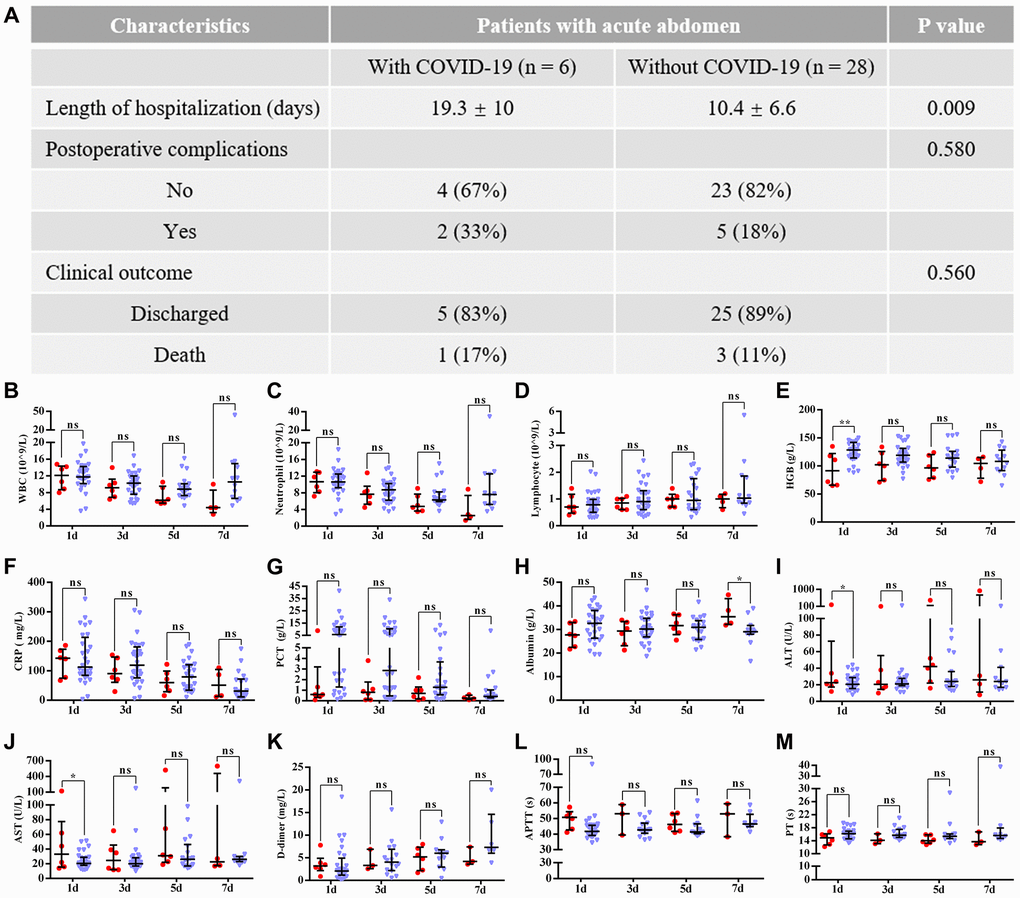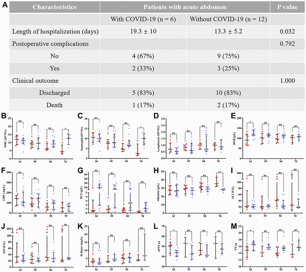 This study had certain limitations that should be discussed. First, due to the lack of definite practical guidance for patients with both acute abdomen and COVID-19 pneumonia, the indication and timing of the surgical treatment was decided empirically instead of being based on evidence. Second, this was a small-sample nonrandomized retrospective study without strict inclusion and exclusion criteria, and as such, there were potential biases that could affect the comparison analysis. Third, the availability of clinical care and the diversity of COVID-19 management may limit the applicability of our results. However, to our knowledge, the results of our study provide the first evidence that emergency surgery could not only improve the outcomes of acute abdomen patients with COVID-19 pneumonia, but also benefit the resolution of pulmonary inflammation. These results hopefully lead to a consensus on the treatment and management of acute abdomen patients with or without COVID-19 during the COVID-19 outbreak.