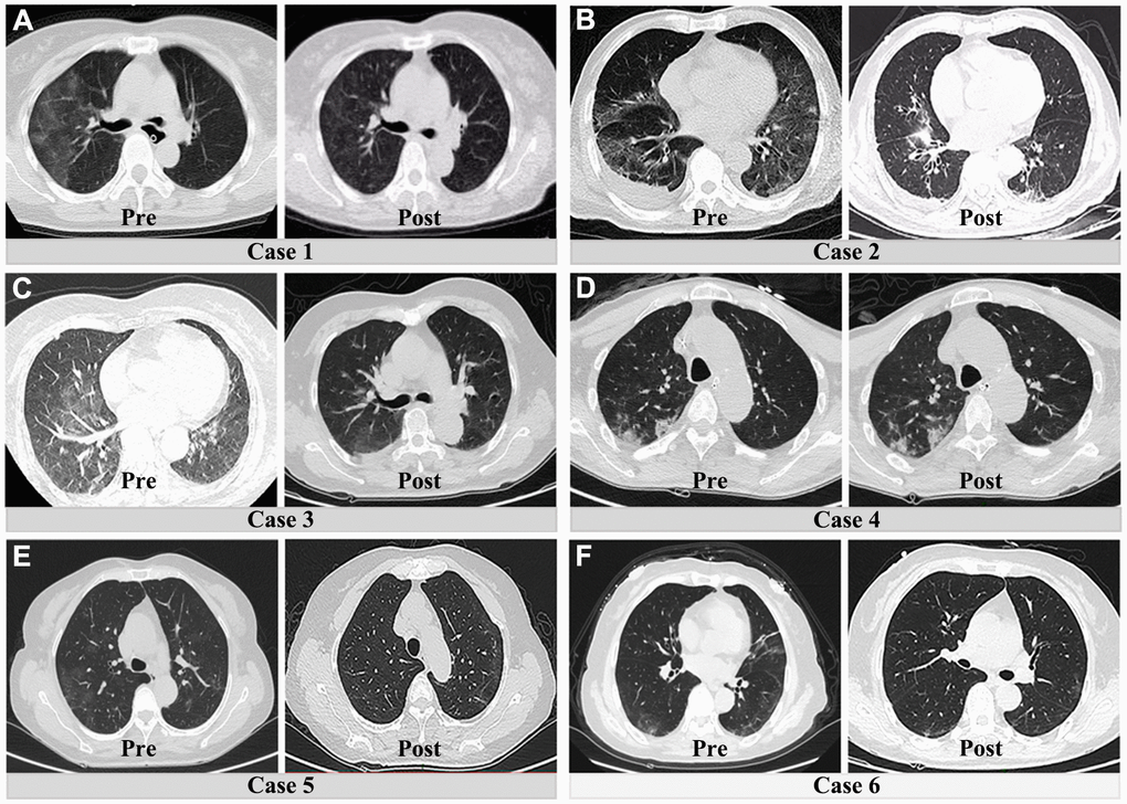 To remove the potential impact of age on the above results, we further compared the pre- and postsurgical differences between patients with COVID-19 and those without COVID-19 pneumonia (between 60 and 80 years old). After age-matching between both groups, the majority of preoperative and postoperative results were consistent with the previous results. As shown in Table 3, patients with COVID-19 pneumonia still had poor preoperative liver and coagulation function. However, the bulk of abnormal preoperative laboratory findings were significantly and rapidly corrected after surgical treatment (Figure 4). In addition, an obvious resolution of lung inflammation was observed after surgery in five patients (83.3%) (Figure 5). These results indicated that COVID-19 pneumonia is associated with poor liver function and coagulation function in acute abdomen patients with COVID-19 pneumonia. Nevertheless, emergency surgery could not only improve the outcomes of COVID-19 pneumonia patients with acute abdomen, but also benefit the resolution of pulmonary inflammation.