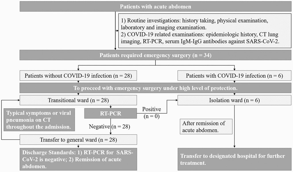 After a detailed history and a complete physical examination, all patients with acute abdomen underwent routine laboratory testing (such as complete blood counts, serum biochemistry and tumor-marker screening) and imaging examination (such as chest X-ray, abdominal ultrasound, contrast-enhanced computed tomography (CT)). Prior to admission, all patients also completed a detailed risk assessment for COVID-19, including typical clinical manifestation and contact history with suspicious or confirmed COVID-19 patients within 14 days. CT lung imaging, quantitative reverse transcription-polymerase chain reaction (RT-PCR) and IgM-IgG antibodies against SARS-CoV-2 were also required for all patients to screen for potential infections. All suspected COVID-19 cases were treated as positive until confirmed. If emergency surgery was required, patients with positive indicators for infection must be taken directly to a designated COVID operation room through a predefined path. Due to the possible false negatives of test kits, all surgical procedures were carried out using a high level of protection, including masks, eye protection, gloves, caps and protective clothing, for the entire duration of the procedure.