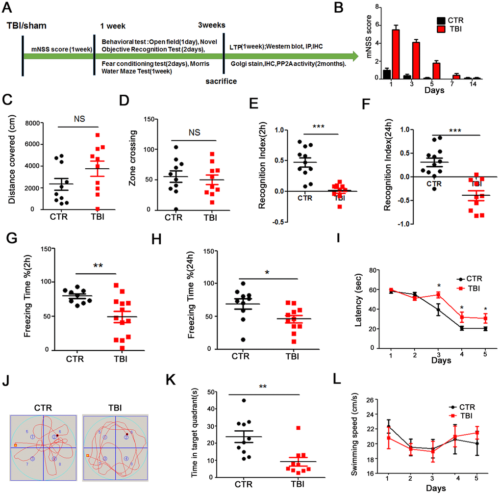 To investigate the effect of traumatic brain injury (TBI) on cognitive function, twenty-four healthy SD rats were randomly divided into 2 groups (control/sham operation and TBI model). The whole experiment was conducted as depicted in Figure 1A. Following TBI induction, we evaluated the Modified Neurological Severity Score (mNSS). The mNSS scoring results showed that the rats returned to normal motor function one week after TBI (Figure 1B). We then performed a series of behavioral tests. Firstly, open field test was carried and the result showed that there was no significant difference in the total distance covered (Figure 1C), and times in the zone crossing (Figure 1D) between the two groups, indicating that TBI does not affect anxiety or exploratory activity levels. The novelty recognition experiment allows to explore short-term memory capacity, the results from this experiment showed that in the TBI group, the curiosity toward exploring new things were significantly reduced, as the time spent for exploration of the new object in 2 hours (Figure 1E) and 24 hours (Figure 1F) were significantly decreased (p value <0.0001). Next, we performed fear conditioning experiment to assess the contextual memory. We found that the TBI rats exhibited significantly lower freezing behavior compared to control in 2 hours (p value =0.07) (Figure 1G) and 24 hours (p value =0.0236) (Figure 1H). Finally, we tested memory and learning abilities using Morris water maze (MWM), and observed that, compared with the control group, the TBI rats showed significantly increased latency to find the hidden platform (p value =0.0434) (Figure 1I). On day 6, the spatial memory was tested by removing the platform. We found a remarkably decreased time spent in the target quadrant in the TBI rats as compared to control group (p value =0.0029) (Figure 1J, 1K), while there was no difference in the swimming speed among the two groups (Figure 1L). Together, these findings strongly demonstrate that TBI causes learning and memory impairments in rats.