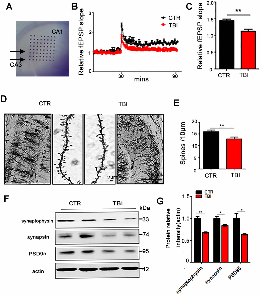 whether TBI could induce synaptic dysfunction. To explore how the synaptic transmission in the CA3-CA1 Schaffer collateral (SC) is impaired, hippocampal CA3-CA1 LTP was recorded by using the MED64 system (Figure 2A). We found that TBI rats showed a reduced slope of field excitatory postsynaptic potential (fEPSP) after high-frequency stimulation (HFS) compared with the control group (p value = 0.0035) (Figure 2B, 2C). To further investigate the morphological basis of the underlying mechanism, we examined the spine density of hippocampal neurons (Figure 2D and Supplementary Figure 1A). Although no significant difference was found in the total dendritic length (Supplementary Figure 1B), the Golgi staining revealed a significant decrease in the dendritic spine density of the TBI rats (p value =0.0029) (Figure 2E) compared with the control. Furthermore, synaptic proteins in the hippocampus of the rat brains were detected by immunoblotting (Figure 2F and Supplementary Figure 1C). A downregulation was observed in the levels of pre-synaptic proteins synapsin (p value =0.0347) and synaptophysin (P value =0.0029), as well as postsynaptic protein PSD95 (p value =0.0437) (Figure 2G and Supplementary Figure 1D). These findings suggest that TBI-induced cognitive impairments might be a reflection of the decreased neural spine density as well as the synaptic dysfunction.