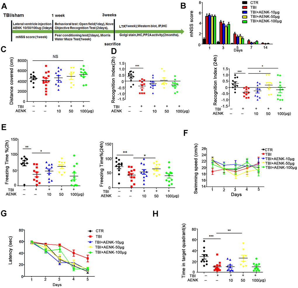 It was shown earlier in this study that TBI induces memory impairments, and activation of AEP was suspected to play a role. To further investigate on that, fifty healthy SD rats were randomly divided into 5 groups of 10-13 animals each, and treated as shown in (Figure 5A). Mock surgery rats served as sham operation control with dimethyl sulfoxide (DMSO) injection into the lateral ventricle, while the remaining are TBI surgery groups and were further divided into four groups as TBI model, TBI +10 μg, +50 μg or +100 μg lateral ventricular injection of AEP inhibitor. We evaluated the mNSS, and the scoring results showed that the rats returned to normal motor function a week after surgery (Figure 5B). The same series of behavioral tests were carried out, and the open field test result showed that there was no significant difference in the total distance covered (Figure 5C), suggesting no difference in locomotor functions among the groups. The results of novelty recognition experiment however showed that in the TBI+AENK groups, the curiosity toward exploring new things was significantly increased, as the time spent for exploration of new object in 24 hours was significantly higher (p value =0.0211 at AENK dose 50μg), although no difference change was observed in 2 hours evaluation (Figure 5D). Next, we performed fear conditioning experiment to assess the contextual memory. We found that the TBI+AENK groups exhibited significantly higher freezing behavior (Figure 5E), compared to control in 2 hours evaluation (p value =0.336 at AENK dose 10 μg) and in 24 hours (p value =0.031 at AENK dose 50 μg). Finally, we tested memory and learning abilities using MWM and found no significant changes in swimming speed among all groups (Figure 5F), but observed a significantly reduced latency to find the hidden platform in the TBI+AENK rats (Figure 5G). On day 6, the spatial memory was tested by removing the platform, and a remarkable increase in the time spent in the target quadrant (Figure 5H) was observed in the TBI+AENK rats compared with the TBI group (p value =0.00652 at AENK dose 50 μg). Together, these data demonstrate that AEP inhibitor could restore learning and memory impairments in TBI rats, further suggesting the implication of AEP in AD-like pathology following TBI.