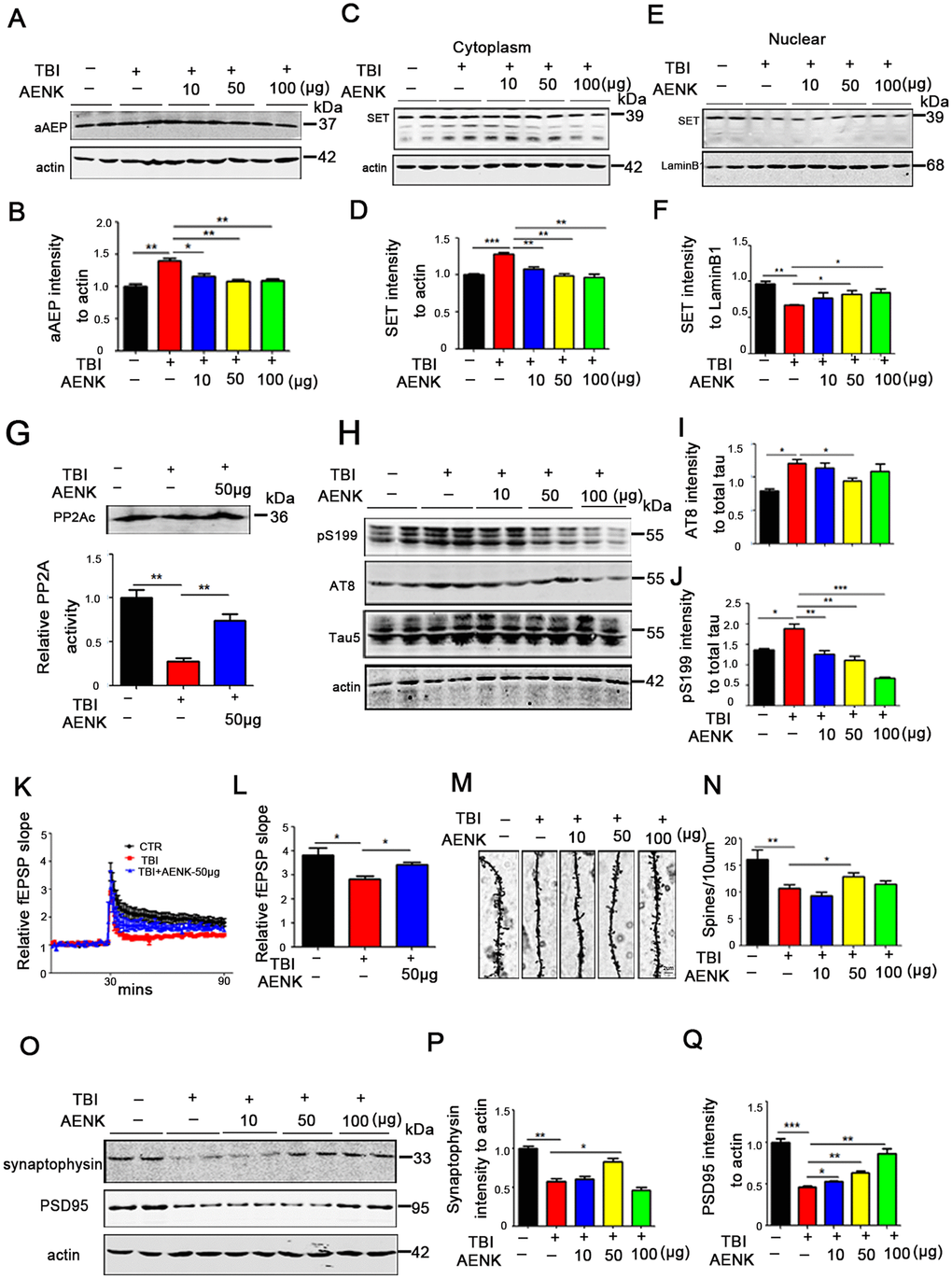 Since synaptic alterations were observed in TBI rats (Figure 2G), we wonder whether AEP could alter synaptic plasticity, and that AEP inhibitor might block or recover this effect. To answer this curiosity, hippocampal CA3-CA1 LTP was recorded by using the MED64 system. We found that TBI induced a decrease in the slope of field excitatory postsynaptic potential (fEPSP) after high-frequency stimulation (HFS) compared with the mock surgery control group, while this effect was significantly recovered in the TBI+AENK group (p value =0.01 at AENK dose 50 μg) (Figure 6K, 6L). To understand to anatomical basis of these changes, we further examined the spine density of hippocampal neurons (Figure 6M). The result revealed a significant increase in the dendritic spine density of the TBI+AENK rats (at AENK dose 50 μg) compared with the TBI group (p value =0.0249 at AENK dose 50 μg) (Figure 6N). Furthermore, we examined synaptic proteins in the hippocampus of the rat brains by immunoblotting (Figure 6O), and an upregulation was observed in the levels of pre-synaptic proteins synaptophysin (p value =0.0135 at AENK dose 50 μg) (Figure 6P), as well as postsynaptic proteins PSD95 (p value =0.0034 at AENK dose 50 μg) (Figure 6Q). These findings suggest that AEP inhibitor blocked or at least decreased the AEP-induced cytosolic retention of SET and at the same time reduced tau hyperphosphorylation, alleviated synaptic damage and improved synaptic plasticity.