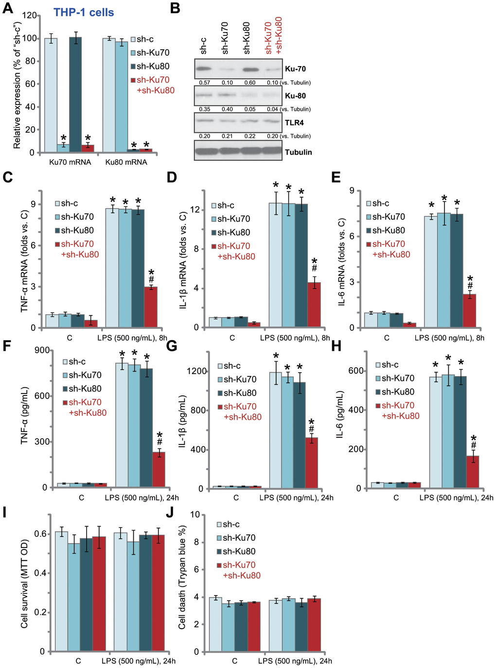 Significantly, LPS (500 ng/mL, 8h)-induced mRNA expression of multiple pro-inflammatory cytokines, including TNF-α (Figure 1C), IL-1β (Figure 1D) and IL-6 (Figure 1E), was significantly inhibited by Ku70 plus Ku80 double knockdown. While Ku70 or Ku80 single knockdown was completely ineffective (Figure 1C-E). Furthermore, Ku70 plus Ku80 double knockdown in THP-1 cells potently inhibited LPS (500 ng/mL, 24h)-induced TNF-α (Figure 1F), IL-1β (Figure 1G) and IL-6 (Figure 1H) protein section. Ku70 or Ku80 single knockdown again failed to inhibit LPS-induced activity (Figure 1F–1H). In THP-1 cells Ku70 and/or Ku80 knockdown failed to change cell viability (MTT OD, Figure 1I) and death (Trypan blue staining, Figure 1J), even after LPS treatment (Figure 1I and 1J). Thus, Ku70 plus Ku80 double knockdown inhibited LPS-induced production of pro-inflammatory cytokines in THP-1 human macrophages.