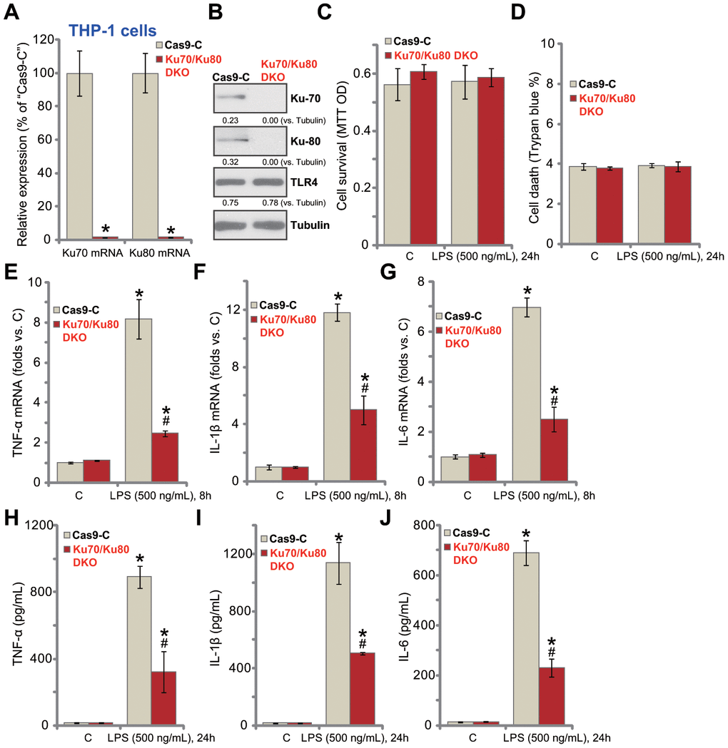To achieve single knockout (SKO) cells, THP-1 human macrophages were transduced with the lenti-CRISPR/Cas9-Ku70 KO construct or the lenti-CRISPR/Cas9-Ku80 KO construct. As shown, Ku70 SKO (Supplementary Figure 1A) or Ku80 SKO (Supplementary Figure 1A) did not alter cell viability (Supplementary Figure 1B) nor inducing cell death (Supplementary Figure 1C) in THP-1 cells. LPS-induced production of TNF-α (Supplementary Figure 1D), IL-1β (Supplementary Figure 1E) and IL-6 (Supplementary Figure 1F) was unchanged in THP-1 cells with Ku70 SKO or Ku 80 SKO (vs. vector control cells). Therefore, Ku70 or Ku80 SKO failed to inhibit LPS-induced pro-inflammatory response in THP-1 cells.