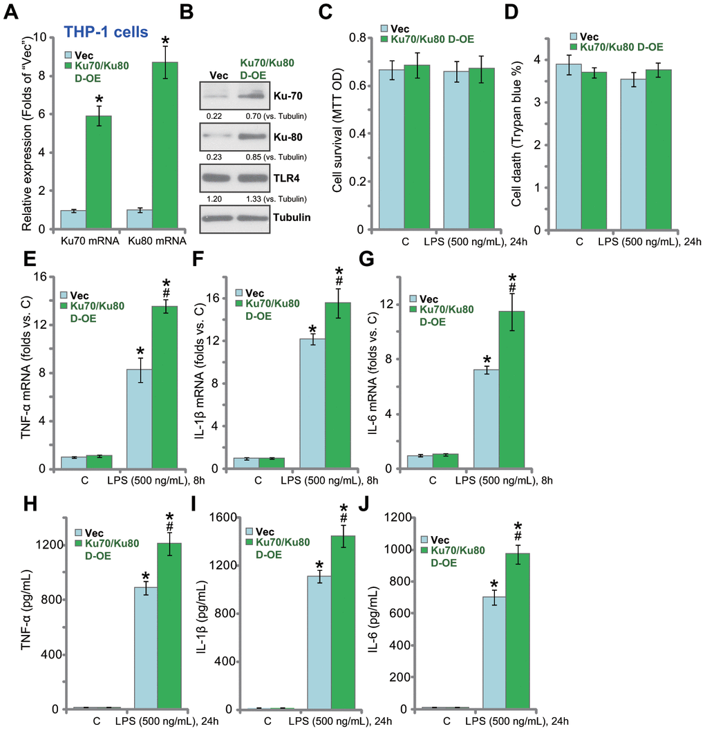 Based on the results above, Ku70 plus Ku80 overexpression could possibly enhance LPS-induced pro-inflammatory response. Therefore, the Ku70-expressing adeno-associated virus (AAV) plus the Ku80-expressing AAV were co-transfected to THP-1 macrophages. Stable cells were established by puromycin selection. Analyzing mRNA expression, by qPCR, confirmed that Ku70 mRNA and Ku80 mRNA levels increased over 6-8 folds in the stable cells (“Ku70/Ku80 D-OE” cells, Figure 3A). Ku70 and Ku80 proteins were upregulated as well in Ku70/Ku80 D-OE cells (Figure 3B). Ku70 plus Ku80 overexpression did not change cell viability (Figure 3C) nor inducing cell death (Figure 3D) in THP-1 cells. Significantly, in the D-OE cells, LPS-induced mRNA expression of pro-inflammatory cytokines, TNF-α (Figure 3E), IL-1β (Figure 3F) and IL-6 (Figure 3G), was indeed enhanced. ELISA assays further confirmed that the production of TNF-α (Figure 3H), IL-1β (Figure 3I) and IL-6 (Figure 3J) by LPS was augmented.