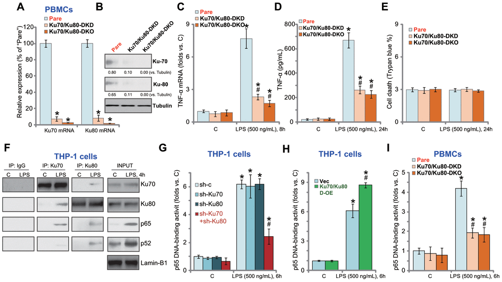 In the primary human PBMCs, Ku70 shRNA lentivirus and Ku80 shRNA lentivirus were applied to silence Ku70 and Ku80 (“Ku70/Ku80-DKD”, Figure 4A and 4B). Furthermore, the lenti-CRISPR/Cas9-Ku70 KO construct and the lenti-CRISPR/Cas9-Ku80 KO construct were co-transfected to PBMCs, resulting in Ku70 and Ku80 double knockout (“Ku70/Ku80-DKO”, Figure 4A and 4B). LPS-induced TNF-α mRNA expression (Figure 4C) and protein production (Figure 4D) were largely inhibited in “Ku70/Ku80-DKD” PBMCs and “Ku70/Ku80-DKO” Trypan blue staining assay results show that Ku70 and Ku80 DKD or DKO failed to induce significant cell death in PBMCs (Figure 4E).