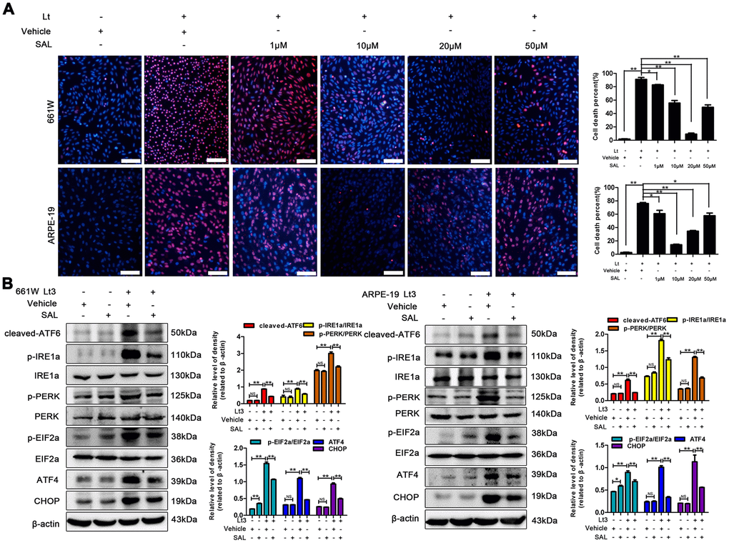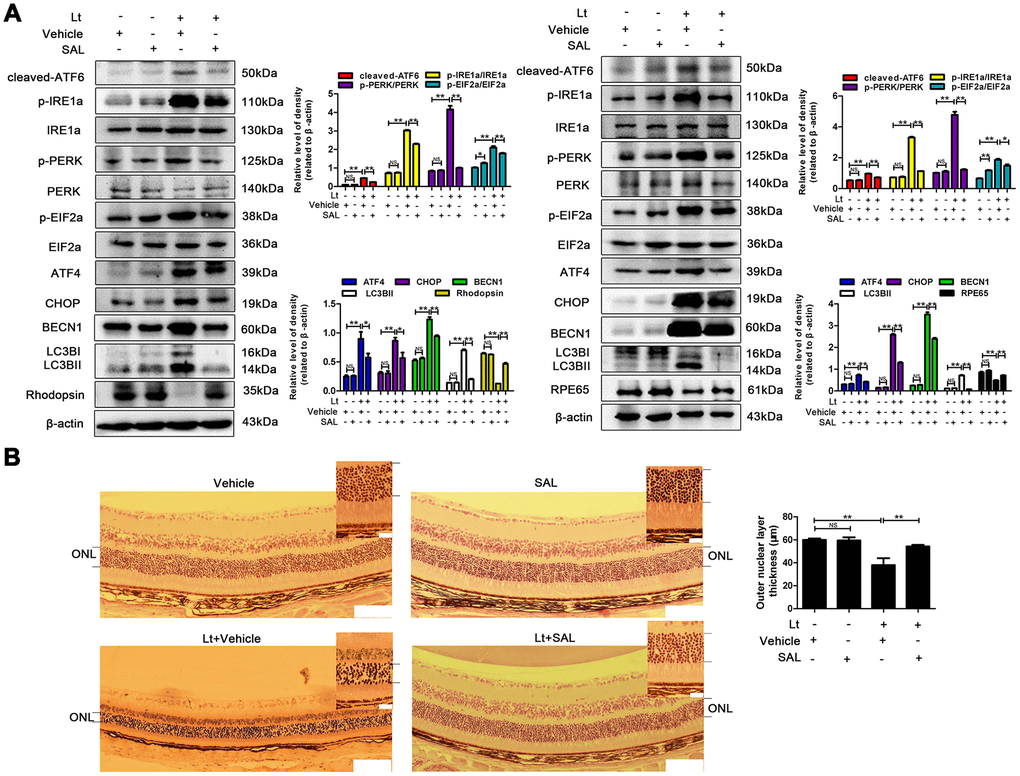 Next, ER stress-related autophagy was verified in light-injured retinas of mice. As shown in Figure 10A, intensive light exposure for 12 h caused a significant increase in the levels of ER stress markers, including cleaved-ATF6, p-IRE1a/IRE1a, p-PERK/PERK, p-EIF2a/EIF2a, ATF4 and CHOP, and elevated the levels of autophagy markers BECN1 and LC3BII in both the retina and RPE/choroid samples compared to the control samples as determined with western blot. However, intraperitoneal injection of SAL significantly suppressed the light-induced activation of ER stress and autophagy, resulting in reduced levels of cleaved-ATF6, p-IRE1a/IRE1a, p-PERK/PERK, p-EIF2a/EIF2a, ATF4, CHOP, BECN1 and LC3BII compared with the light-damaged vehicle group (P<0.05; Figure 10A). In addition, light-induced retinal injury was quantitatively evaluated by measuring the level of rhodopsin, a marker of photoreceptors, and RPE65, a marker of RPE cells. Figure 10A shows that intensive light exposure resulted in marked damage to photoreceptors and RPEs, significantly reducing the levels of rhodopsin and RPE65, while SAL injection markedly attenuated the decreased levels of these two markers compared with the light-damaged vehicle group ((P<0.05). Moreover, histological analysis showed that light exposure caused obvious structural disorders in the ONL of the retina and significantly reduced the thickness of the ONL, while SAL injection attenuated the light-induced decrease of ONL thickness and maintained the normal structure of the retina (Figure 10B). These results suggest that excessive light exposure may cause ER stress and prolonged autophagy in the retina; however, suppressing ER stress may inhibit over-activated autophagy and protect the retina against light injury.