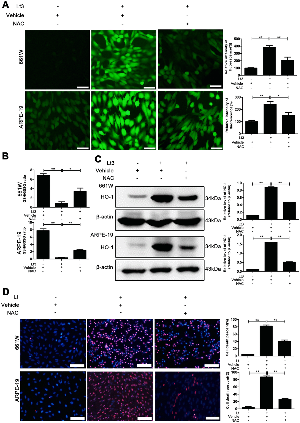 The death of photoreceptors/RPEs is the principal event in the pathogenesis of AMD, and it is known that the excessive exposure to natural or unnatural light may accelerate this death or the death process [8]. Schick reported that sunlight exposure during working life is an important risk factor for AMD [43] and Sui reported that individuals with more sunlight exposure are at a significantly increased risk of AMD [11]. Photoreceptors and RPE cells are rich in photosensitizers [3, 44]. The excessive electromagnetic energy of photons is absorbed by these photosensitizers, which may break the bonds of other molecules via direct electron exchange or hydrogen exchange and generate excessive free radicals [2, 3]. In this study, oxidative-stress damage caused by visible light exposure in photoreceptors (661W cells) and RPE cells (ARPE-19 cells) was verified by the increased HO-1 and the decreased GSH/GSSG ratio. These results suggest that light exposure led to a severe redox imbalance in the cells and that suppressing oxidative stress with the antioxidant NAC protects photoreceptors and RPE cells against light damage. Light-induced oxidative damage might be an important step in the pathogenesis of light-related retinal diseases, especially in AMD, in which increased reactive oxygen species (ROS) production, and mitochondria dysfunction are observed together with increased abnormal protein aggregation and inflammation in the photoreceptor/RPE layer, leading to oxidative stress-induced damage to the retinal pigment epithelium which is considered to be a key factor in the pathogenesis of AMD [45].
