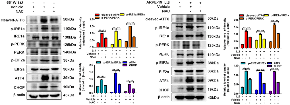 Excessive ROS in cells may lead to depletion of the GSH pool and compromise of the function of PDI, which disrupts the folding process of proteins in the ER, causing the accumulation of unfolded or misfolded proteins and triggering ER stress [16]. Therefore, the markers in three signal pathways of ER stress were determined after 661W and ARPE-19 cells were exposed to 1500 Lux light for 1–3 days. As shown in Figure 3, light exposure significantly caused activation of cleaved-ATF6, p-IRE1a/IRE1a, p-PERK/PERK, p-EIF2a/EIF2a, ATF4 and CHOP compared with the dark control group. The levels of these markers reached a peak on the third day of light exposure indicating that light exposure indeed induces ER stress in photoreceptors and RPE cells. To further assess the role of ER stress in the light-induced cell death pathway, salubrinal (SAL), an ER stress inhibitor, was used to suppress ER stress under light-exposure conditions. As shown in Figure 4A, treatments with SAL (1 μM, 10 μM, 20 μM, and 50 μM) were protective against light damage compared with the vehicle group, as determined using the PI/Hoechst staining assay. The optimum SAL concentration, which provided the best protection against light damage and led to the lowest cell death rate was around 20 μM for 661W cells and 10 μM for ARPE-19s. Treatment with SAL (20 μM for 661W cells and 10 μM for ARPE-19s) consistently suppressed the activation of ER stress, reducing the levels of cleaved-ATF6, p-IRE1a/IRE1a, p-PERK/PERK, p-EIF2a/EIF2a, ATF4 and CHOP after 3 days of light exposure compared with the light vehicle group (Figure 4B). However, treatment with SAL under dark conditions caused a slight increase in p-EIF2a (P<0.05, vs dark vehicle group), suggesting that SAL is pharma-cologically functional since SAL treatment may prevent EIF2α dephosphorylation by inhibiting the protein complex GADD34/protein phosphatase 1 (PP1) [36]. The correlation between oxidative stress and ER stress under the light-exposed condition was then examined. As shown in Figure 5, treatment with the antioxidant NAC (5 mM for 661W cells and 2.5 mM for ARPE-19s) significantly suppressed ER stress, markedly reducing the levels of cleaved-ATF6, p-IRE1a/IRE1a, p-PERK/PERK, p-EIF2a/EIF2a, ATF4 and CHOP on the third day of light exposure compared with the vehicle group, which suggests that light induced-oxidative stress might be the upstream step, prior to ER stress, in the death cascade.