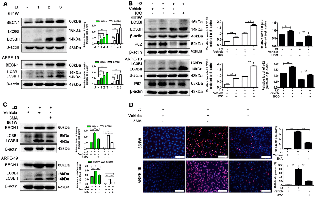 Prolonged ER stress may trigger autophagy-lysosome-dependent ERAD to remove accumulated abnormal proteins and protein aggregates thus, light-induced autophagy in photoreceptors and RPEs was further investigated. BECN1 is a widely used marker for assessing autophagy because it participates in the initial stage of autophagosome formation [37]. The transformation from LC3BI to LC3BII is another important process employed in the study of autophagy activation [38]. Klionsky et al suggested LC3BII /β-actin as an indicator for detecting autophagy [39]. As shown in Figure 6A, after 661W and ARPE-19 cells were exposed to light for 1–3 days, the levels of BECN1 and LC3BII in the light-damaged group significantly increased in a dose-dependent manner compared with the dark control group (P<0.05). In addition, the autophagic flux caused by light exposure was monitored. Hydroxychloroquine (HCO) may compromise the acidity of lysosomes. This interrupts autophagic clearance, which may cause the accumulation of LC3BII if the autophagic flux is blocked [38]. As shown in Figure 6B, treatment with 20 μM HCO remarkably caused the accumulation of LC3BII in 661W cells and ARPE-19s under the light-exposure condition compared with the light vehicle group (P<0.05), indicating that light exposure induces a complete autophagic process, which may be blocked by HCO treatment. In addition, p62, another marker protein of autophagy, whose expression level was negatively correlated with autophagy flux, was detected [40–42]. As shown in Figure 6B, the level of p62 in the light damaged group was significantly lower than in the dark control group, and HCO treatment was able to attenuate the decrease of p62 under the light exposure condition, indicating that light exposure induced autophagy and increased autophagy flux. Next, the role of autophagy in the light-induced death cascade was investigated. As shown in Figure 6C, treatment with 3-methyladenine (3MA; 2.5 mM for 661W cells, 1 mM for ARPE-19 cells) significantly reduced the levels of BECN1 and LC3BII in the cells exposed to light for 3 days compared with the light vehicle group and remarkably reduced the cell death rate assessed by PI/Hoechst staining under the light-exposed condition, as shown in Figure 6D. However, the levels of BECN1 and LC3BII in the 3MA-treated light-exposed group were still slightly higher than those in the vehicle dark group, suggesting that 3MA treatment simply suppresses over-activated autophagy caused by light exposure.