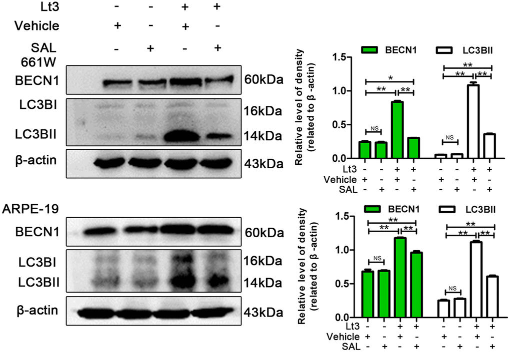 The mice were divided into four groups: vehicle group (n=6), SAL-treated group (n=6), light-damaged vehicle group (n=6), and light-damaged SAL-treated group (n=6). SAL (dissolved in 1% DMSO saline) was intraperitoneally injected with a dose of 1 mg/kg once a day for 7 days. On the third day of administration, the pupils were dilated with 1% Atropine eye drops, and the mice were exposed to continuous 7000 Lux visible light for 12 h. After light exposure, the mice were fed in the animal room with the normal light/dark cycle. On the fifth day of light exposure, the mice were sacrificed by intraperitoneal injection of excessive pentobarbital sodium, and the eyeballs were enucleated. One eye was sectioned for further histological analysis, and another eye’s retina was collected for western blot analysis.