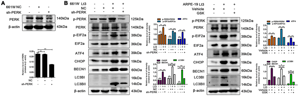 Cell culture media and additives were obtained from the HyClone Company (Beijing, China). N-acetyl-L-cysteine (>99%), Salubrinal, Hoechst/PI and a Reactive Oxygen Species Assay Kit were purchased from Beyotime Biotechnology (Shanghai, China). The 3-methyladenine was purchased from Sigma-Aldrich (Shanghai, China). Hydroxychloroquine was purchased from Tokyo Chemical Industry (Shanghai, China). GSK2606414 (>99.38) was purchased from Med Chen Express (New Zealand, USA). PERK (Cat. No. 3192), IRE1a (Cat. No. 3294) and p62(Cat. No. 5114) antibodies were purchased from Cell Signaling Technology (Shanghai, China). EIF2a (Cat. No.sc-133132) antibodies were acquired from Santa Cruz Biotechnology (Beijing, China). Rhodopsin (Cat. No. OM186133) antibodies were purchased from OmnimAbs (Shanghai, China). LC3B (Cat. No. ab192890) antibodies were purchased from Abcam (Cambridge, MA, USA). BECN1 (Cat. No. 11306-1-AP) antibodies were purchased from Proteintech (Wuhan, China). P-IRE1a (Cat. No. 13013), p-PERK (Cat. No. 12814), ATF6 (Cat. No. 24382), p-EIF2a (Cat. No. 11279), ATF4 (Cat. No. 32007), CHOP (Cat. No. 40744), RPE65(Cat. No. 49495), β-actin (Cat. No. 21800) and secondary antibodies were obtained from Signalway Technology (St. Louis, MO, USA).