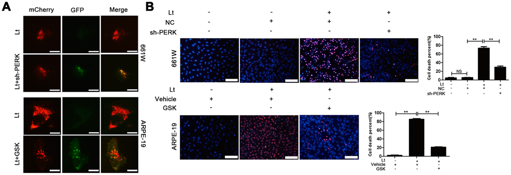 To further verify whether light exposure induces ER stress-related autophagy, ER stress was further suppressed with SAL and the influence of ER stress on autophagy activation was examined. As shown in Figure 7, treatment with SAL significantly reduced the levels of BECN1 and LC3BII compared with the vehicle light damaged group (P<0.05), indicating that suppressing ER stress may block the light-induced activation of autophagy. Previous studies have shown that the PERK signal may participate in activation of ER-related autophagy. Therefore, in the current study, PERK activity was suppressed using one of the following two methods: knocking down PERK expression with lentivirus-mediated shRNA in 661W cells or treatment with GSK2606414 (GSK), a specific inhibitor of PERK in ARPE-19 cells. As shown in Figure 8A, the expression of PERK in 661W cells was significantly knocked down by the specific shRNA (sh-PERK) compared with the negative control (NC) group (P<0.05). In addition, activation of the downstream factors of the PERK pathway (p-PERK/PERK, p-EIF2a/EIF2a, ATF4 and CHOP) was also markedly suppressed under the light-exposed condition. Similarly, treatment with GSK also significantly suppressed activation of the PERK signal in RPE cells under the light-exposed condition, as shown in Figure 8B, causing obvious reductions in the levels of p-PERK/PERK, p-EIF2a/EIF2a, ATF4 and CHOP compared with the vehicle light damaged group. Next, the influence of PERK inhibition on the activation of autophagy was assessed. Figure 8B shows that both PERK knockdown and GSK treatment caused significant reduction in the levels of BECN1 and LC3BII in light-exposed cells compared with the light vehicle group (P<0.05). Furthermore, the influence of PERK inhibition on light-induced autophagy flux was evaluated by tracking mCherry-GFP-LC3B double labeled autophagosomes expressed by adenoviruses. The green fluorescence of GFP-labeled LC3B is quenched due to the acidic environment after autophagosomes integrate with lysosomes. Therefore, the autolysosomes with mCherry-GFP double labeled-LC3B simply turn red (the color of cherries). However, when autophagy is blocked, the number of autolysosomes is reduced and some autophagosomes with mCherry-GFP double labeled-LC3B show the overlaid yellow color. As shown in Figure 9A, the number of autolysosomes was greatly reduced in the cells with PERK inhibition. Some autophagosomes show the overlaid yellow color, yet a large number of autolysosomes in the control cells show the red color, indicating that either PERK knockdown or GSK treatment may block autophagy. Importantly, PERK knockdown and GSK treatment significantly reduced the death rate in 661W and ARPE-19 cells in the light-exposed condition as evaluated with PI/Hoechst staining, as shown in Figure 9B. Taken together, these results suggest that inhibiting ER stress via PERK signal may suppress light-induced prolonged autophagy, and that inhibiting ER stress-related autophagy protects photoreceptors and RPE cells against light damage.