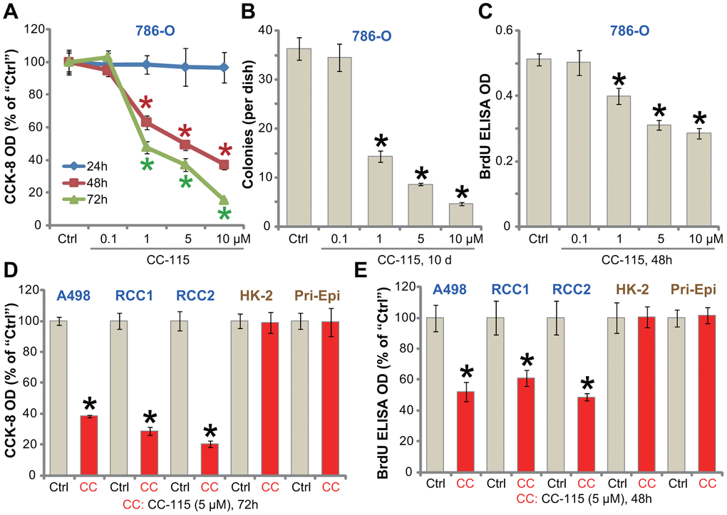 The potential activity of CC-115 on other RCC cells was studied. In both established (A489 cell line) and primary human RCC cells (derived from two patients, “RCC1/RCC2”), treatment with CC-115 (5 μM) for 48/72h significantly inhibited cell viability (CCK-8 optical density/OD, Figure 1D) and proliferation (BrdU ELISA OD, Figure 1E). Importantly, in the immortalized HK-2 human proximal tubule epithelial cells and primary human renal epithelial cells (“Pri-Epi”), CC-115 treatment (5 μM, 48/72h) was non-cytotoxic (Figure 1D) nor anti-proliferative (Figure 1E). These results indicated a cancer cell specific effect by the compound. Collectively, CC-115 potently inhibited RCC cell survival and proliferation.