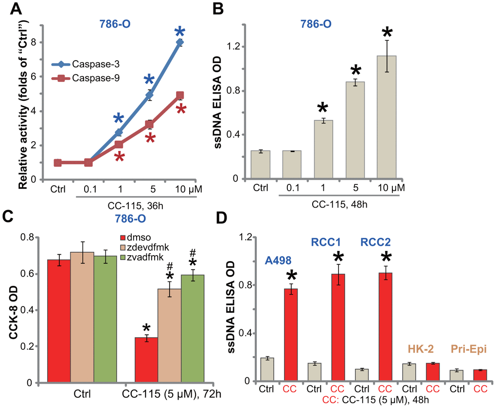 Apoptosis activation is an important mechanism for reduced viability and proliferation of cancer cells. By analyzing caspase activity, we show that the caspase-3 and the caspase-9 activities were significantly increased in CC-115 (1-10 μM)-treated 786-O cells (Figure 2A). Furthermore, CC-115 resulted in single strand DNA (ssDNA) accumulation in 786-O cells, further confirming apoptosis activation (Figure 2B). The caspase-3 specific inhibitor z-DEVD-fmk and the pan caspase inhibitor z-VAD-fmk largely attenuated CC-115 (5 μM)-induced viability reduction in 786-O cells (Figure 2C). These results demonstrate that CC-115 induced apoptotic death in 786-O RCC cells.