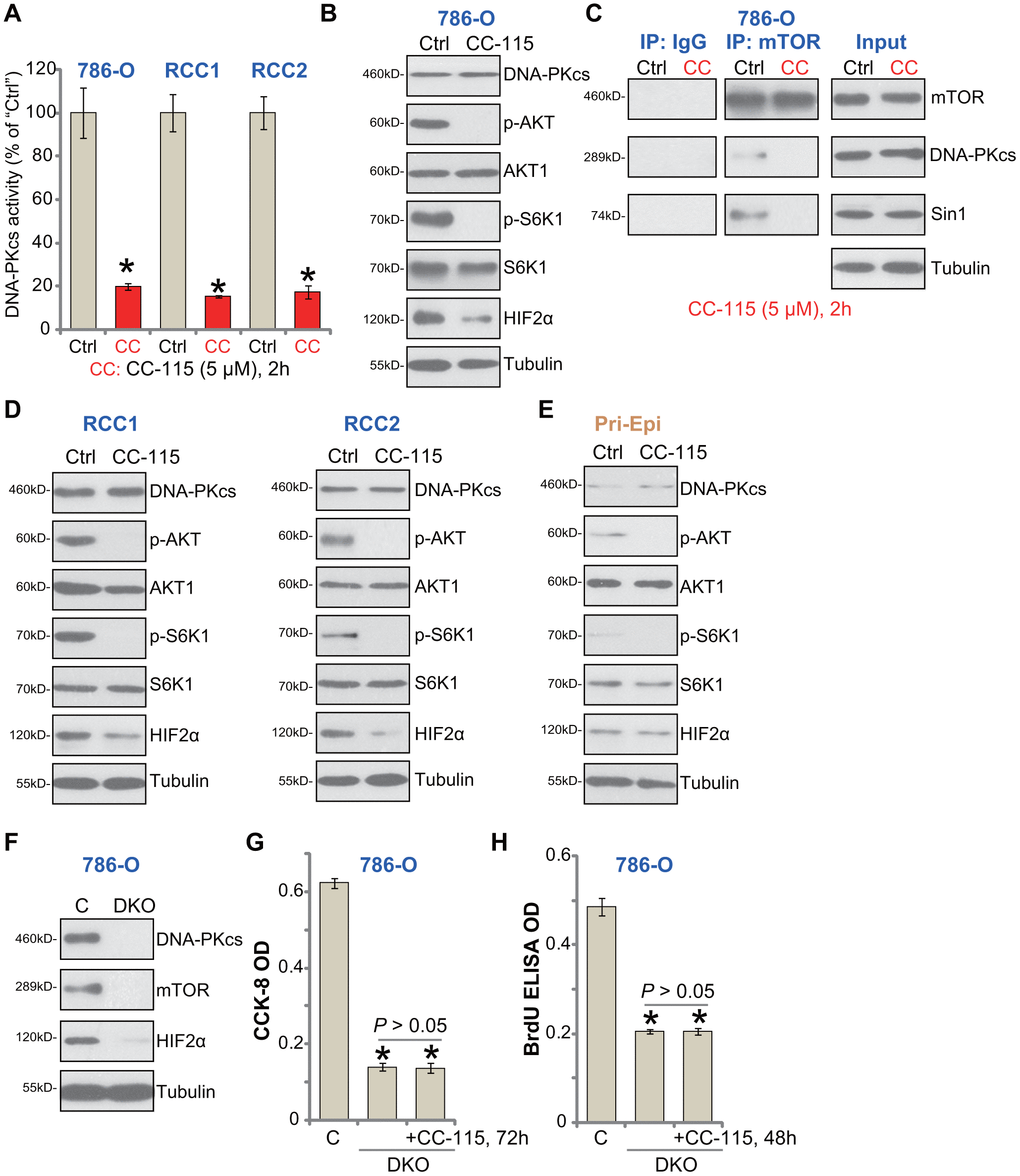 To demonstrate that CC-115 acts as a DNA-PKcs and mTOR dual inhibitor, we tested its inhibitory effect on signaling pathways in RCC cells. When analyzing DNA-PKcs activity using a previously-described assay [22], we found that CC-115 treatment (5 μM, 2h) significantly inhibited DNA-PKcs activity in 786-O and primary RCC cells (“RCC1/2”) (Figure 3A). DNA-PKcs protein level was unchanged with CC-115 treatment (Figure 3B). The dual inhibitor blocked phosphorylation of S6K1 (Ser-389, the indicator of mTORC1 activation [3]) and AKT (Ser-473, the indicator of mTORC2 activation) in 786-O cells (Figure 3B). Furthermore, one mTORC2 target protein, HIF-2α [15, 23], was downregulated (Figure 3B).