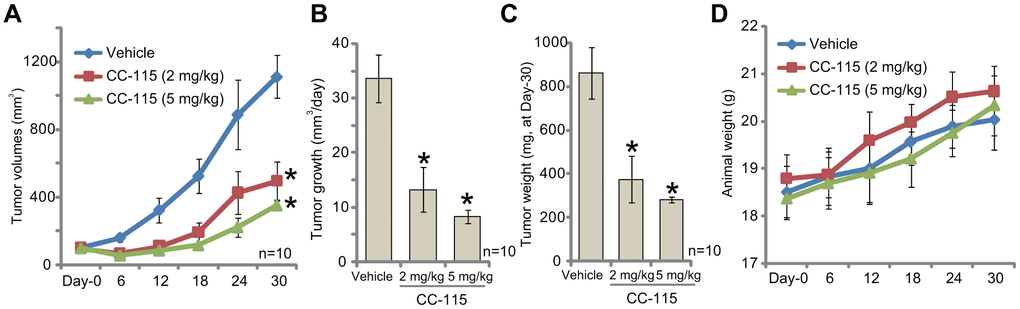 The in vivo activity of CC-115 was tested. As described [11, 12], 786-O cells were s.c. injected into the flanks of the nude mice. Xenografts were established within three weeks (tumor volumes close to 100 mm3, labeled as “Day-0”). The tumor-bearing mice were randomly assigned into three groups, receiving CC-115 or vehicle control. Results demonstrated that oral administration of CC-115, at 2 mg/kg or 5 mg/kg, significantly inhibited subcutaneous 786-O xenograft growth in nude mice (Figure 5A). The estimated daily 786-O tumor growth, calculated by (tumor volume at Day-30 subtracting tumor volume at Day-30)/30, was dramatically inhibited in CC-115-treated mice (Figure 5B). Tumors of all three groups were isolated at Day-30 and weighted (Figure 5C). Tumors with CC-115 treatment were much lighter than the vehicle-treated tumors (Figure 5C). The mouse body weights were not significantly different between the three groups (Figure 5D). Collectively, oral administration of CC-115 inhibited subcutaneous 786-O xenograft growth in mice.