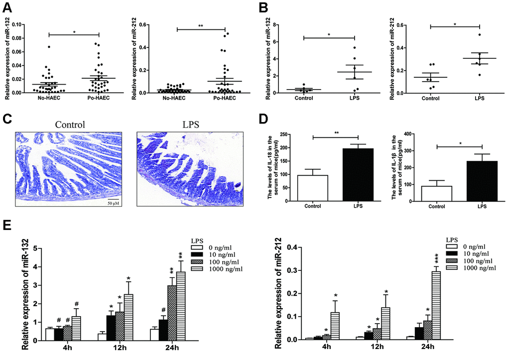 Upregulation of miR-132/-212 in patients with postoperative HAEC and enteritis animal models