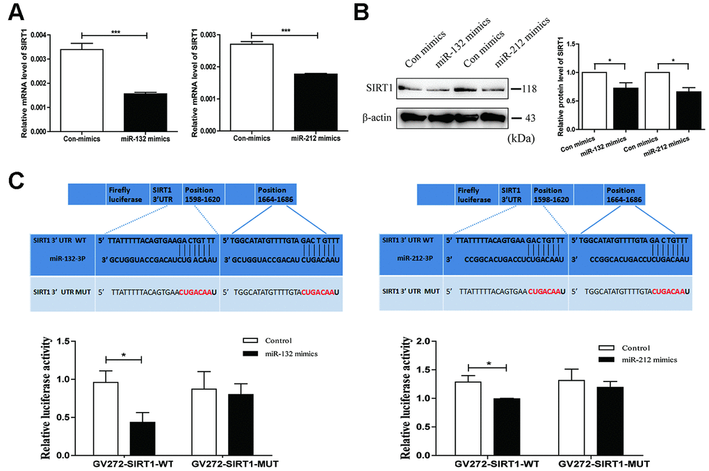 To further study whether miR-132 and miR-212 interacted with SIRT1, we transfected miR-132 and miR-212 mimics in HT29 cell line. qRT-PCR analysis was carried out to evaluate miR-132/-212 expression levels in HT29 cell line treated with miRNA mimics (Supplementary Figure 1A). Then, the following results verified the negative influence of miR-132/-212 to SIRT1 mRNA and protein levels (Figure 3A and 3B). In view of the nearly perfect pairing between the SIRT1-3′untranslated region (UTR) and the miR-132/-212 seed sequence (Figure 3C upper), in-vitro assays were then used to confirm the ability of miR-132 and miR-212 to suppress SIRT1. The dual luciferase assay indicated that relative-luciferase vitality was inhibited in HT29 cells transfected with miR-132 and miR-212 mimics and plasmid GV272-SIRT1-Wild. Nevertheless, there was no obvious difference in relative-luciferase vitality when HT29 cells were transfected with GV272-SIRT1-Mut and miR-132/-212 mimics compared with GV272-SIRT1-Mut and Control (Figure 3C lower). In general, the findings proved that SIRT1 was a direct target of miR-132/-212.