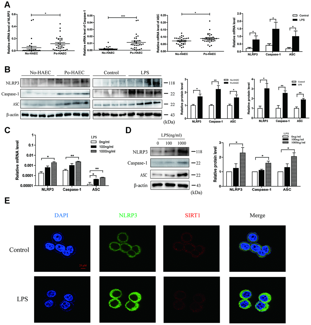 Inflammasome activation has been proved to account for many disease progression [20]. In order to find out whether activation of NLRP3 inflammasome participated in HAEC, the relative NLRP3, ASC and Caspase-1 levels were determined among dilated segments of 32 Po-HAEC and 32 No-HAEC groups by qRT-PCR. As shown in Figure 4A, these genes level showed a significantly increase in po-HAEC group, and so were in mice challenged with LPS. Consistently, similar changes of these genes at protein expression were observed in patients with po-HAEC and LPS-stimulated mice (Figure 4B). To assess whether LPS treatment can induce pro-inflammatory microenvironment, we incubated HT29 cells with 100 or 1000ng/ml LPS. As expected, LPS increased the mRNA and protein levels of NLRP3, ASC and Caspase-1 in vitro (Figure 4C and 4D). Moreover, immunocytochemical assays were employed to evaluate the localization of NLRP3 and SIRT1. NLRP3 staining intensity was enhanced while SIRT1 showed a downward trend upon LPS treatment (Figure 4E). The results of immunofluorescence quantitative analysis were listed in Supplementary Figure 1D.