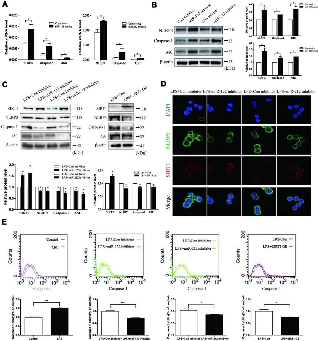 Since previous research have given evidence of the anti-inflammatory function of SIRT1 via inhibiting NLRP3 inflammasome and IL-1β [21, 22], we focused on the role of miR-132/-212-SIRT1-NLRP3 inflammasome in LPS-induced cell injury. MiR-132 and miR-212 mimics were transfected into HT29 cells, which increased the mRNA and protein expression of NLRP3, ASC and Caspase-1 (Figure 5A and 5B). Meanwhile, we constructed the plasmid to over-express SIRT1 and miRNA inhibitors to suppress the expression of miR-132/-212. Their transfection efficiency was measured by qRT-PCR (Supplementary Figure 1C and 1D). As shown in Figure 5C left, miR-132 and miR-212 inhibitor could partially abrogate LPS promotion effect. Similarly, SIRT1 overexpression resulted in a decrease in the level of active NLRP3, Caspase-1 and ASC (Figure 5C right). MiR-132 and miR-212 inhibitor transfection increased SIRT1 staining intensity and suppressed NLRP3 staining intensity in LPS-stimulated HT29 cells (Figure 5D). We showed the results of immunofluorescence quantitative analysis in Supplementary Figure 1E.