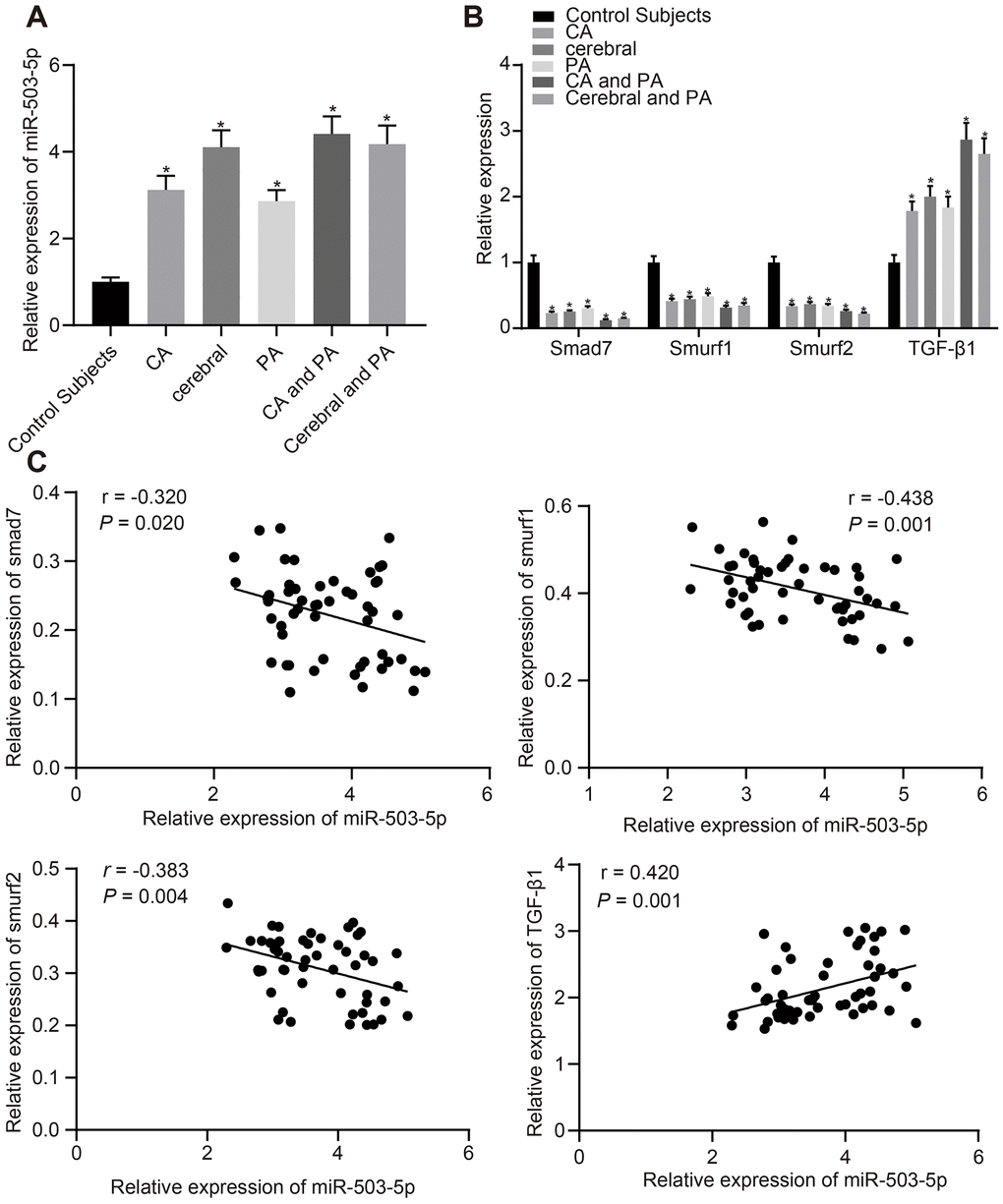 We first collected detailed information of patients with atherosclerosis (recorded in Table 1). Plasma was collected from patients with atherosclerosis and healthy individuals to determine the expression of miR-503-5p, smad/TGF-β signaling pathway molecules (smad7, smurf1, smurf2, and TGF-β1) using reverse transcription-quantitative polymerase chain reaction (RT-qPCR). The findings displayed that compared with healthy individuals, the expression of miR-503-5p and TGF-β1 was increased at different degrees in patients with coronary atherosclerosis, cerebral atherosclerosis, peripheral atherosclerosis, combined coronary atherosclerosis and peripheral atherosclerosis, and combined cerebral atherosclerosis with peripheral atherosclerosis, while the expression of smad7, smurf1, and smurf2 was decreased at different degrees (p < 0.05) (Figure 1A, 1B), which showed a certain linear correlation (Figure 1C).