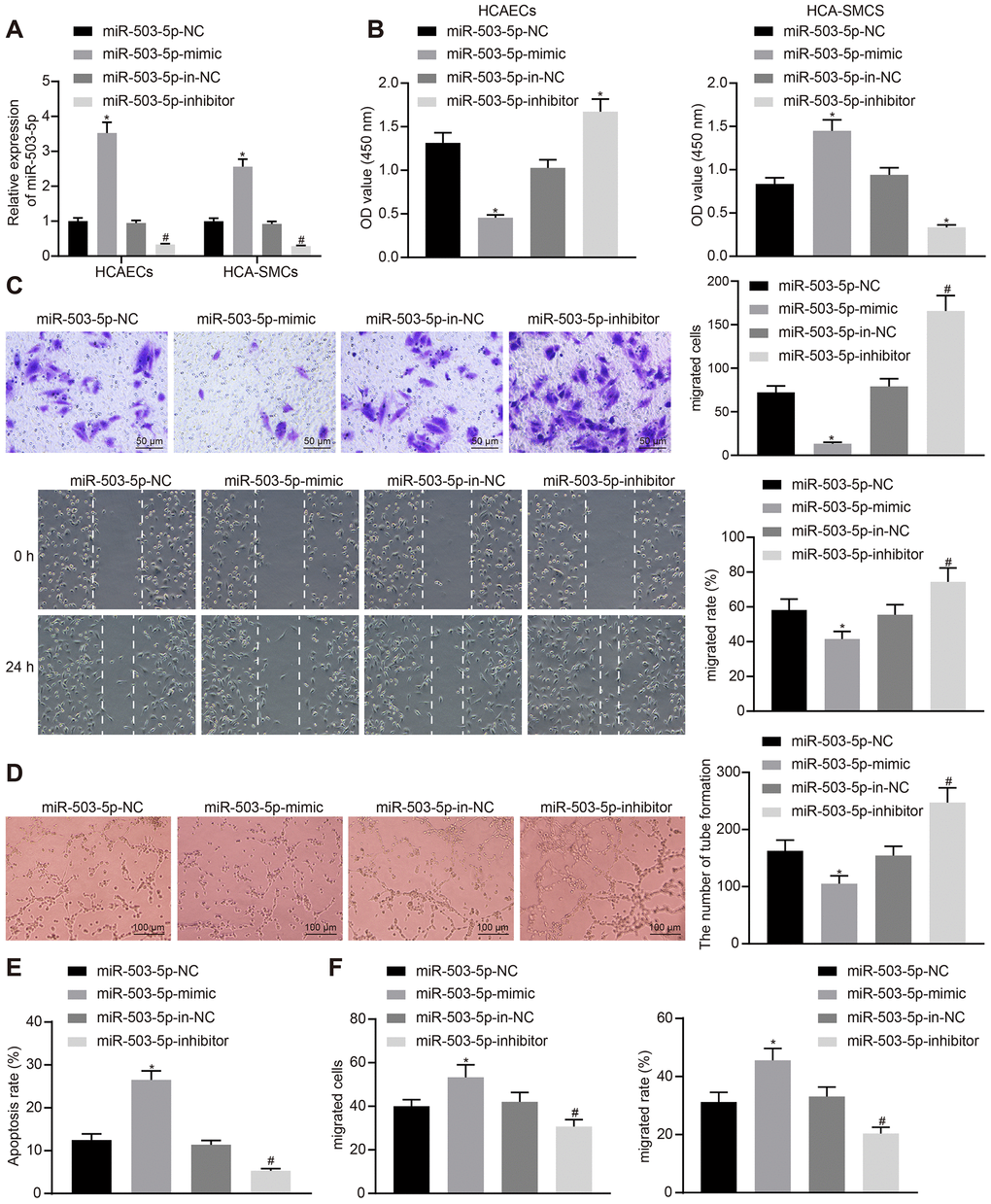 In order to study the effects of miR-503-5p on HCAECs and HCASMCs, HCAECs and HCASMCs were initially treated with exogenous miR-503-5p mimic, exogenous miR-503-5p inhibitor, miR-mimic negative control (NC), and miR-inhibitor NC. RT-qPCR showed increased expression of miR-503-5p in HCAECs and HCASMCs treated with exogenous miR-503-5p mimic, and decreased expression of miR-503-5p in HCAECs and HCASMCs treated with exogenous miR-503-5p inhibitor (p < 0.05) (Figure 2A). Cell counting kit-8 (CCK-8), transwell chamber assays, scratch test, Matrigel-based angiogenesis assays, and flow cytometry revealed that the overexpression of miR-503-5p could suppress the proliferative, migrating, and angiogenic abilities of HCAECs and promote their apoptosis, while enhancing proliferation and migration of HCASMCs (p < 0.05). However, the downregulation of miR-503-5p exerted reverse effects (p < 0.05) (Figure 2B–2F). These results suggested the suppressive effects of miR-503-5p on proliferation, migration, and angiogenesis of HCAECs and promotive effects of miR-503-5p on proliferation and migration of HCASMCs.