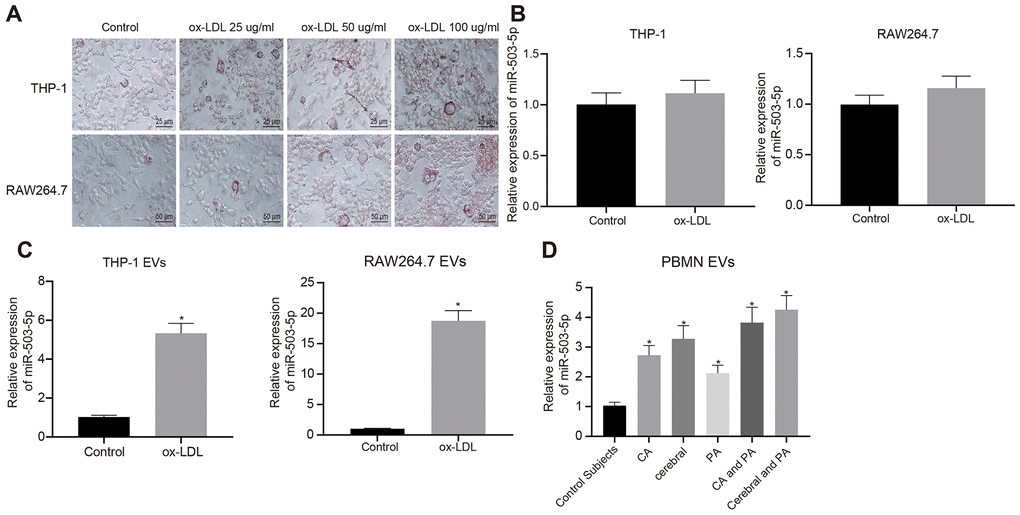 In order to explore the role of miR-503-5p in macrophage-EVs of atherosclerosis model, PMA-induced THP-1 (100 ng/mL, 24 h) or RAW264.7 cells were treated with ox-LDL (25 μg/mL, 50 μg/mL and 100 μg/mL). Oil red O staining showed an increase in staining intensity in a concentration-dependent manner, suggesting that atherosclerosis models were successfully constructed after treatment with ox-LDL (Figure 4A).