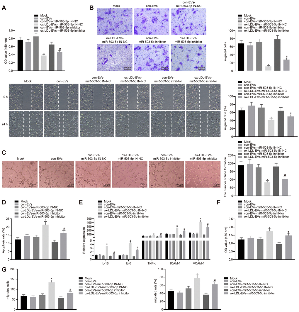 HCAECs co-cultured with ox-LDL-EVs displayed inhibited proliferative, migrative, and angiogenic capabilities, and promoted apoptosis and secretion of inflammatory factors and adhesion molecules (p < 0.05) (Figure 6A–6F). On the contrary, the depletion of miR-503-5p could reverse the aforementioned changes. HCASMCs co-cultured with ox-LDL-EVs showed increased proliferation and migration and that the downregulation of miR-503-5p could reverse the facilitative roles of ox-LDL-EVs in the proliferation and migration of HCASMCs (p < 0.05) (Figure 6G–6I).