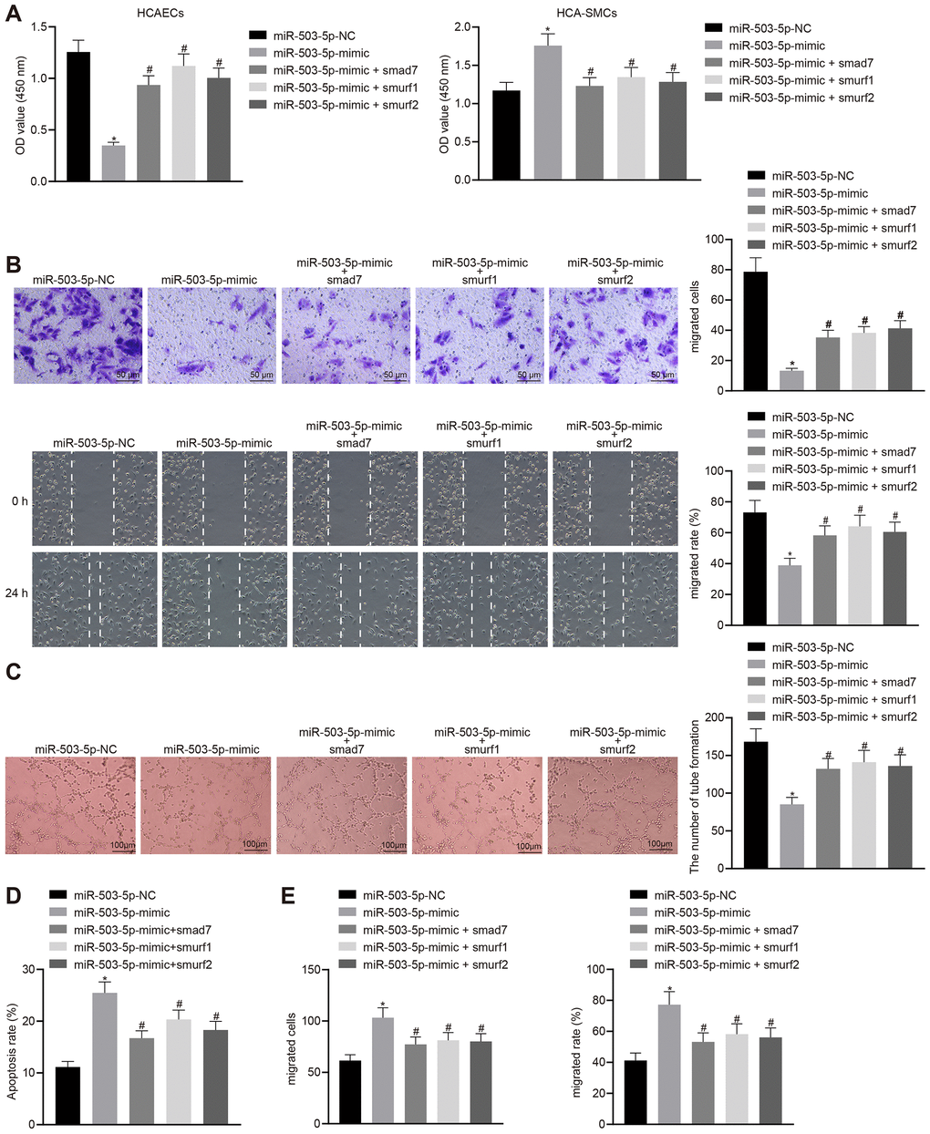 HCAECs and HCASMCs were treated with exogenous miR-503-5p mimic and the expression vector containing smad7, smurf1, or smurf2 gene to explore the effects of miR-503-5p, Smad7, smurf1, and smurf2 in the cellular biology of HCAECs and HCASMCs. Overexpression of miR-503-5p could suppress proliferating, migrating, and angiogenic capabilities, and induce apoptosis of HCAECs (p < 0.05) (Figure 7A–7D), while facilitating proliferation and migration of HCASMCs (p < 0.05) (Figure 7A, 7E). HCAECs and HCASMCs that were treated with the expression vector containing smad7, smurf1, or smurf2 gene could reverse these changes (p < 0.05) (Figure 7A–7E). Therefore, the down-regulation of Smad7, smurf1, and smurf2 conferred the effects of miR-503-5p on the functions of HCAECs and HCASMCs.