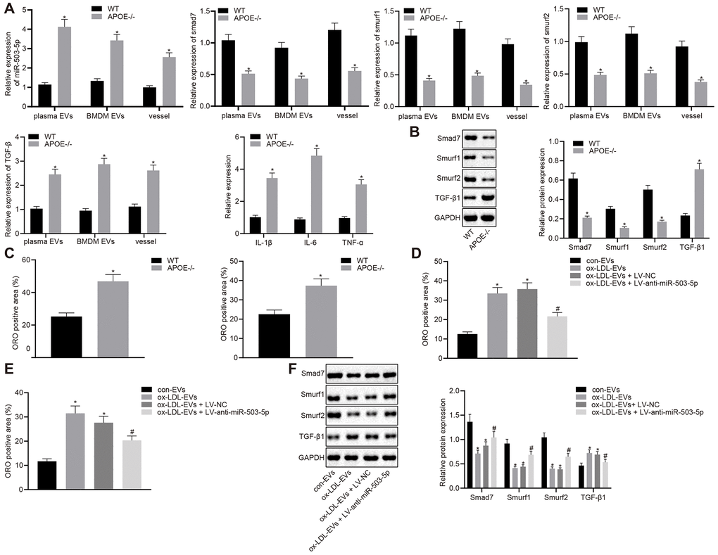 RT-qPCR was lastly adopted to determine the levels of miR-503-5p, smad7, smurf1, smurf2, IL-1β, IL-6, and TNF-α in plasma-EVs, macrophage-EVs, and vascular tissues of ApoE-/- mice (Figure 8A). The results revealed that the expressions of miR-503-5p and TGF-β1 were elevated in plasma-EVs, macrophage-EVs, and vascular tissues of ApoE-/- mice, while the expressions of smad7, smurf1, and smurf2 were decreased. Meanwhile, Western blot analysis showed reduced protein levels of smad7 and smurf1/2 in mouse arterial tissues but increased TGF-β protein levels in the vascular tissues of ApoE-/- mice (p < 0.05) (Figure 8B). Oil red O staining showed increased lipid deposition in mouse arterial tissues, which aggravated the progression of atherosclerosis (p < 0.05) (Figure 8C). To further verify the pro-atherosclerotic role of miR-503-5p in the formation of atherosclerotic plaques in mice, C57BL/6J WT mice were injected with EVs derived from macrophages with or without ox-LDL treatment, followed by injection with lentivirus expressing anti-miR-503-5p and anti-miR-503-5p NC. Oil red O staining (Figure 8D) and Western blot analysis (Figure 8E) demonstrated that depleted levels of miR-503-5p reduced lipid deposition, but increased the expressions of smad7, smurf1, and smurf2 in mouse arterial tissues (p < 0.05). These findings proved that the expression of miR-503-5p was upregulated in atherosclerosis and the inhibition of miR-503-5p could subsequently hinder the progression of atherosclerosis.