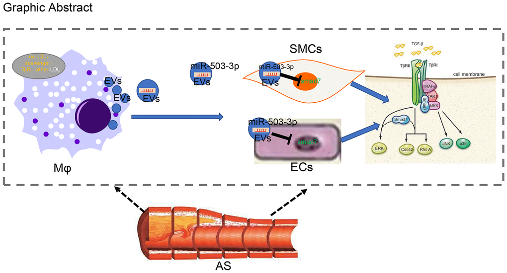 Our results demonstrated that miR-503-5p was enriched in plasma-EVs and macrophage-EVs in atherosclerosis. The aberrant expression of miRNAs has a clearly established role in the process of atherosclerosis [18]. miR-150 is demonstrated to be highly expressed in PMA-induced THP-1 cells in atherosclerosis [19]. Nguyen et al. have indicated that several miRNAs, including miR-503, are abundantly expressed in macrophage-derived EVs in atherosclerosis [17], which is consistent with our findings. Moreover, bioinformatics analysis, in combination with the dual luciferase reporter gene assay validated that miRNA-503-5p could target and negatively regulate smad7, smurf1, and smurf2, being enriched in the TGF-β signaling pathway. The TGF-β signal is dysregulated in the development of atherosclerosis [13]. smad7 expression has been demonstrated to display a reduction in atherosclerosis [15]. Cao et al. have revealed that downregulated levels miR-503 could elevate Smurf2 levels by regulating TGF-β/Smad2 signaling [12]. Also, miR-503 could target smad7 and regulate its expression via TGFβ1 signaling pathway [20], which will be further elucidated through the following serial experiments.