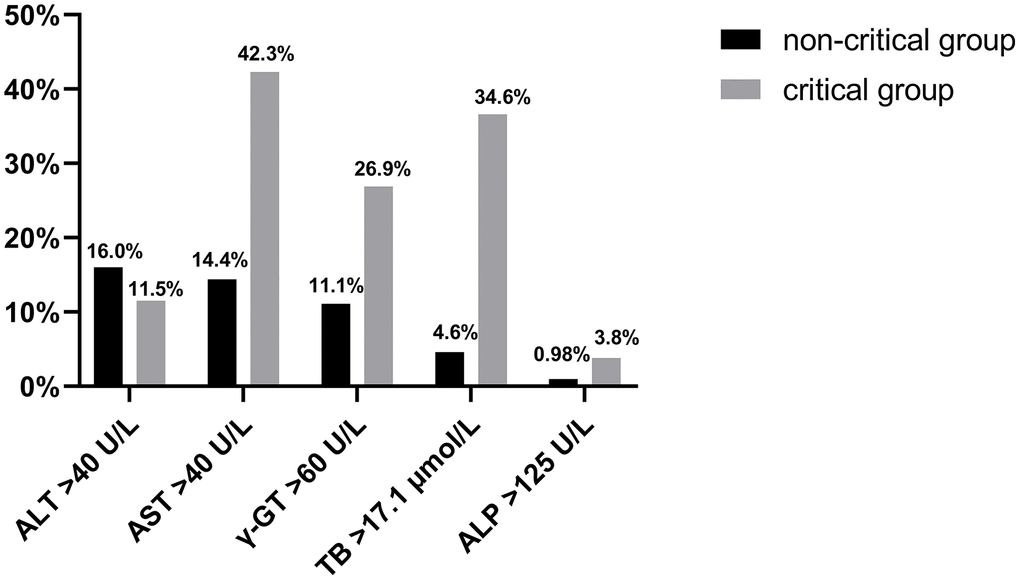 Ninety-eight (29.5%) of the 332 COVID-19 patients were admitted with liver injury based on baseline liver function tests, including 18 (69.2%) in the critical group and 80 (26.1%) in the non-critical group. There was a significantly higher probability of liver injury in the critical group (p<0.0001). The rates of AST, γ-GT, and TB abnormalities were significantly higher in the critical group than in the non-critical group (Figure 1). The degree of concurrent liver injury was less severe in the COVID-19 patients; the mean of ALT, AST, ALP, γ-GT, and TB did not exceed the upper limit of normal value (ULN) by twofold (Table 1).