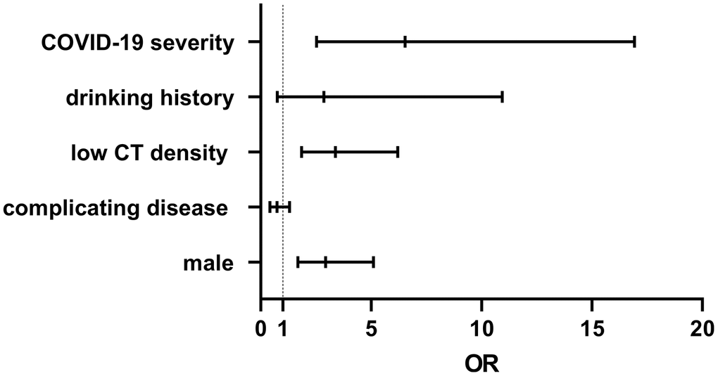 Many risk factors such as patient’s sex, COVID-19 severity, drinking history, low liver CT density, and complicating diseases were analyzed by binary logistic regression. The results revealed that liver injury strongly correlate with patient’s sex (OR 2.936, 95% CI 1.688–5.106, p<0.0001), COVID-19 severity (OR 6.543, 95% CI 2.528–16.93) and low liver CT density (OR 3.387, 95% CI 1.85–6.201, p<0.0001, Figure 2).