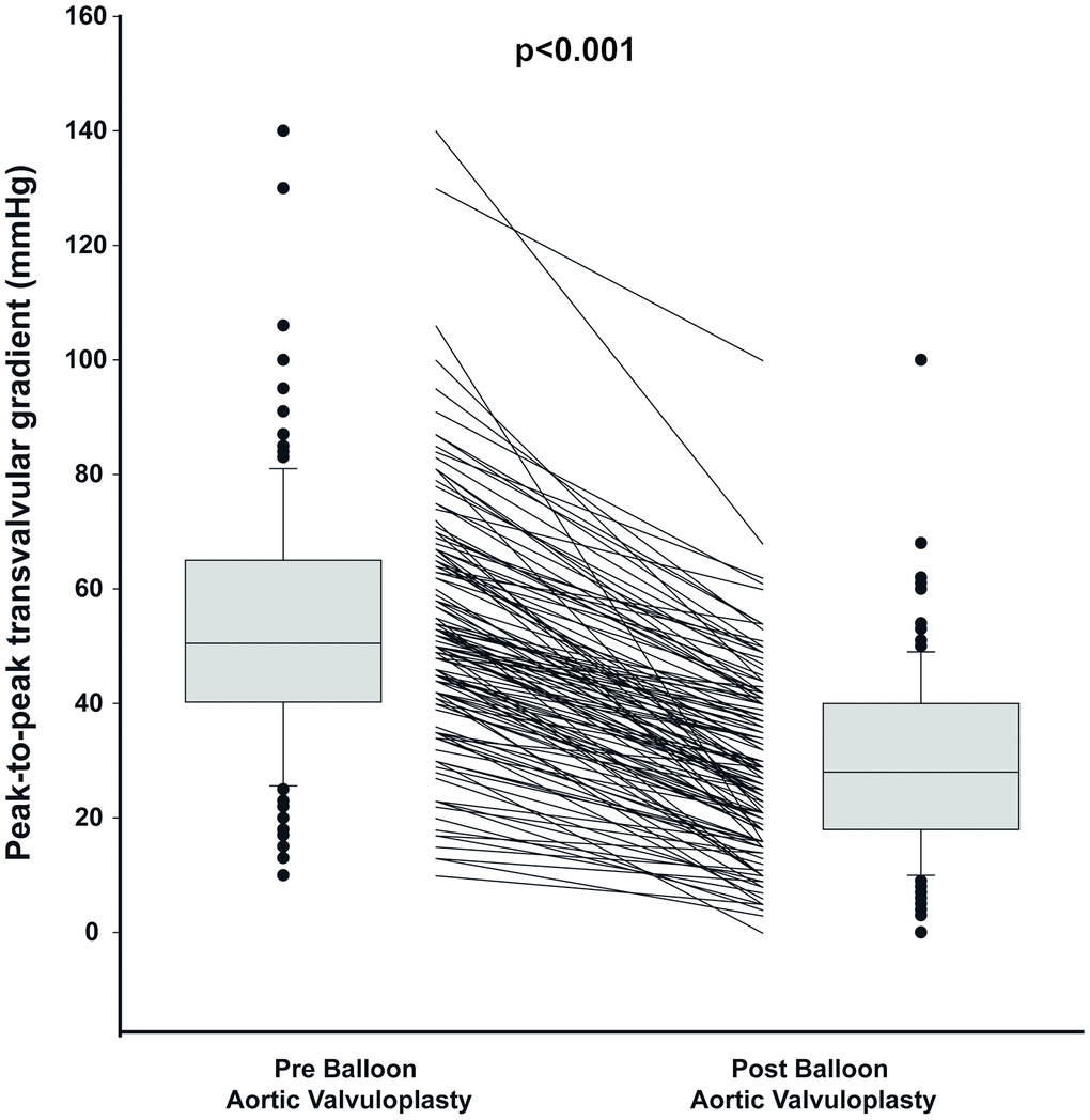 BAV induced a substantial reduction of the peak-to-peak aortic valve gradient from 53±21 to 29±15mmHg (p<0.001; Figure 1), with a decrease in gradient of at least 50% in 65% of the patients. A worsening in aortic regurgitation after BAV was observed only in 2 patients (in both cases from mild to moderate aortic regurgitation).