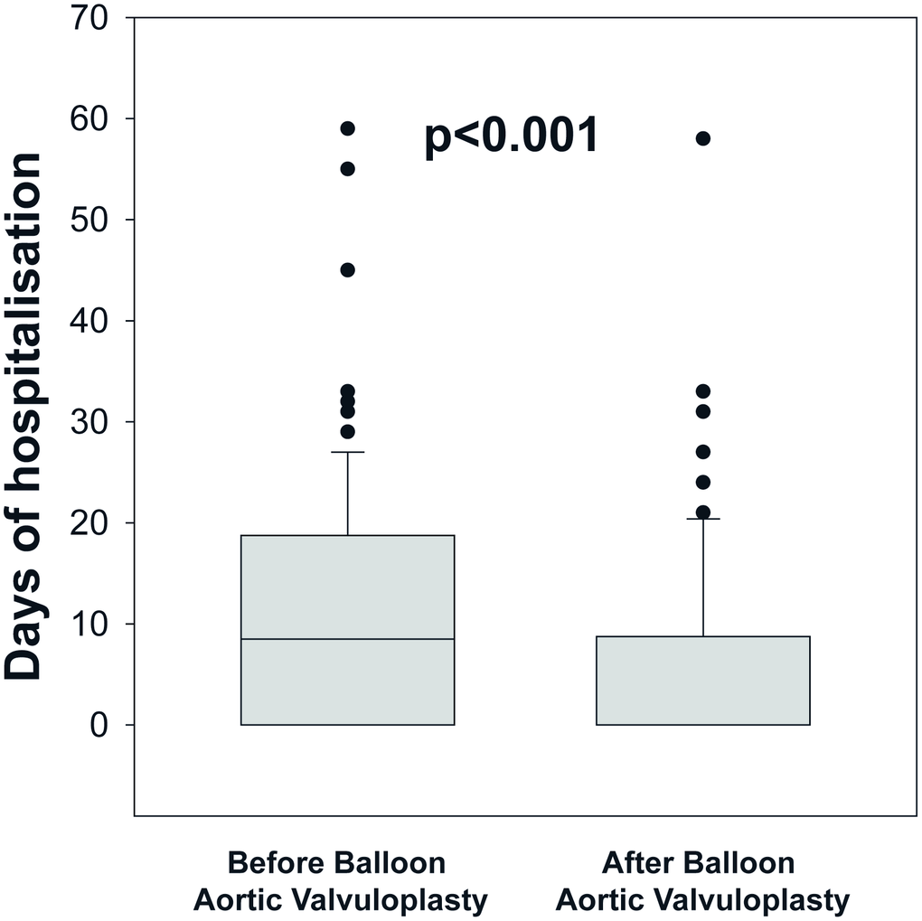 During 1-year follow-up, 57 patients (43%) died. In the whole cohort, the median of days of HF hospitalization prior BAV was 9 (0-19) and decreased after BAV to 0 (0-9), p<0.001 (Figure 2). Therefore, the time spent in hospital has been more than halved, from 8.1%±19.7% prior BAV to 2.7%±5.6 after BAV (p<0.001). The median of days before discharge after BAV was 3 [2–5].