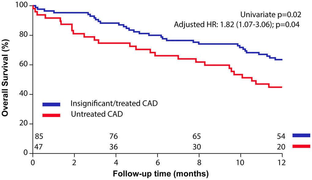 During 1-year follow-up patients with untreated CAD had a higher mortality compared to patients with insignificant/treated CAD (Survival: 6-month: 64±5% vs. 80±4%; 1-year: 45±7% vs. 66± 7%; p=0.02; HR: 1.82 (1.07-3.06); p=0.02, Figure 3).