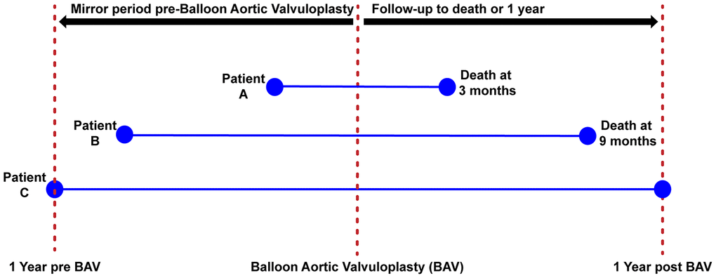 We collected the incidence and number of days of hospitalization for HF post BAV up to 1-year follow-up (or death) and prior BAV in a mirrored period of interrogation. Thus, pre-BAV, the interrogation period finished one day and started one year before BAV (i.e. the days of HF hospitalization before BAV, from admission to index procedure, if any, were included). However, if a patient died before one year of follow-up, the interrogation period in which we count days of HF hospitalisation before BAV was reduced to the exact same number of days lived by the patient after BAV (Figure 4).